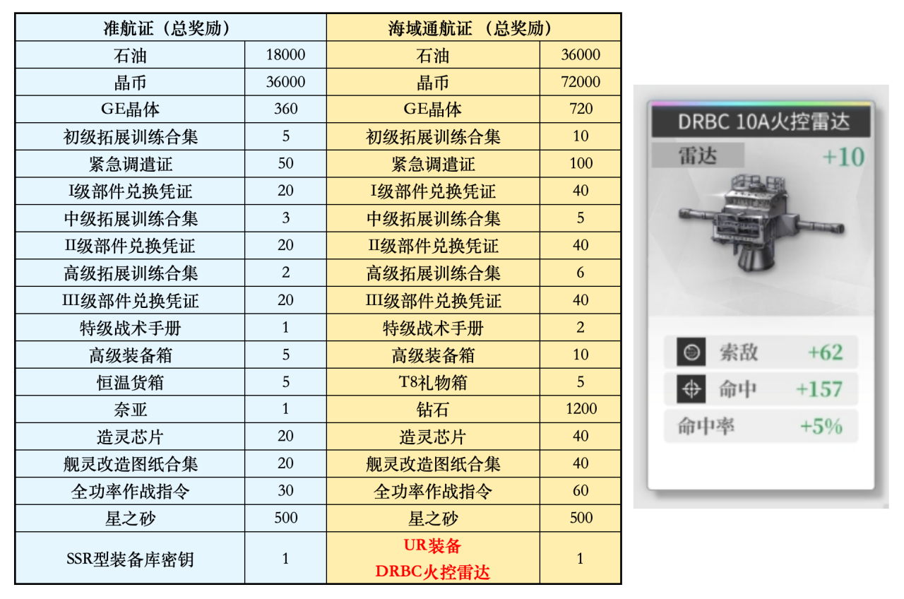 游戏设「准航证」和「海域通航证」两种,任何指挥官均可以进行及领取「准航证」的任务和奖励,而「海域通航证」需要付费解锁。