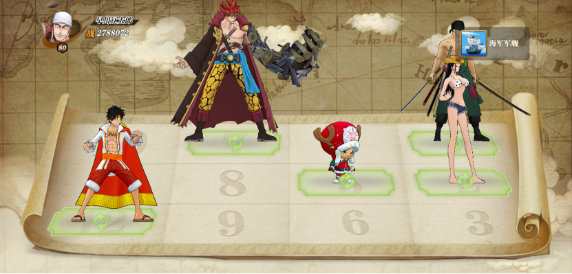 阵容及站位如下:新世界路飞,新世界罗宾,新世界索隆,新世界乔巴,基德(战国、莫里亚等高属抗的肉都可以)