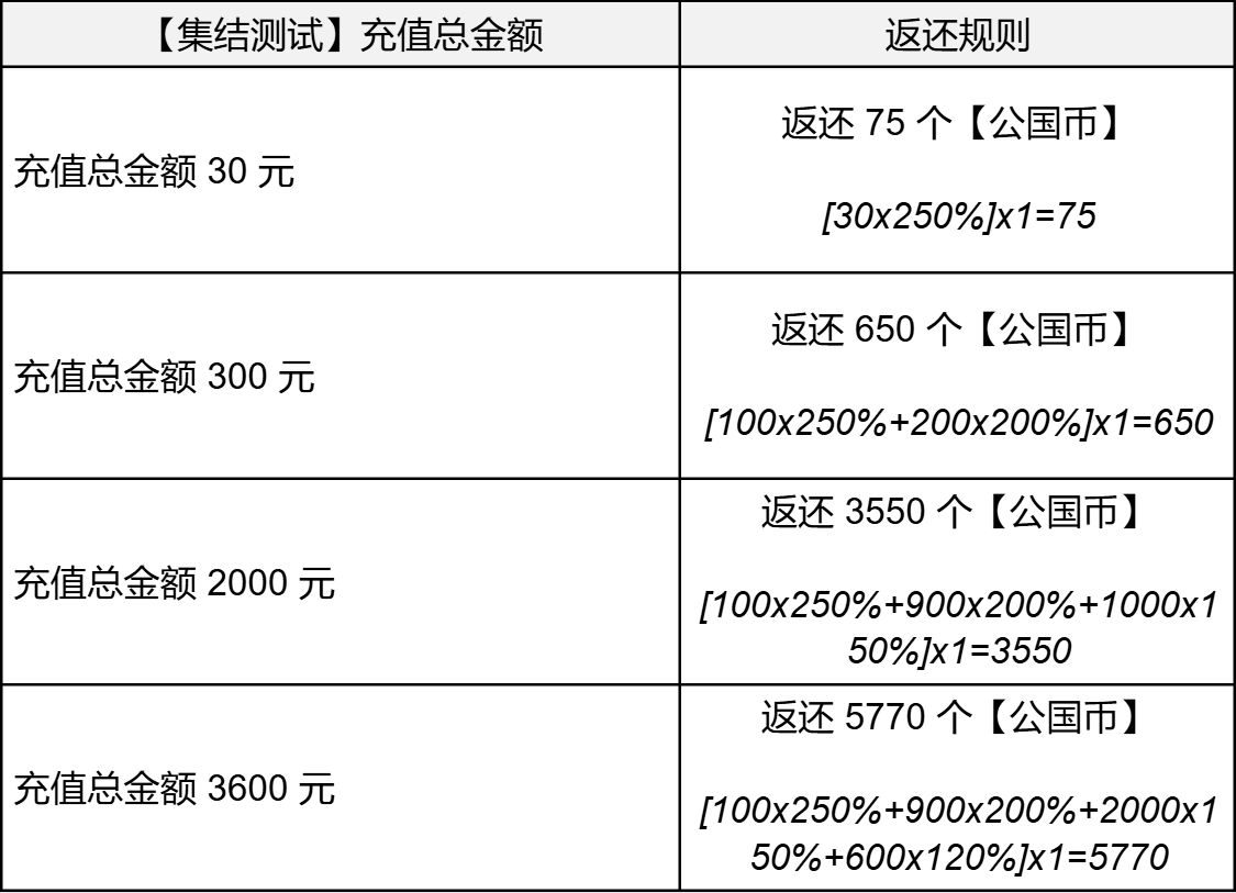 【集结测试】期间,指挥官充值总金额将在正式公测后按照以下规则进行返还: