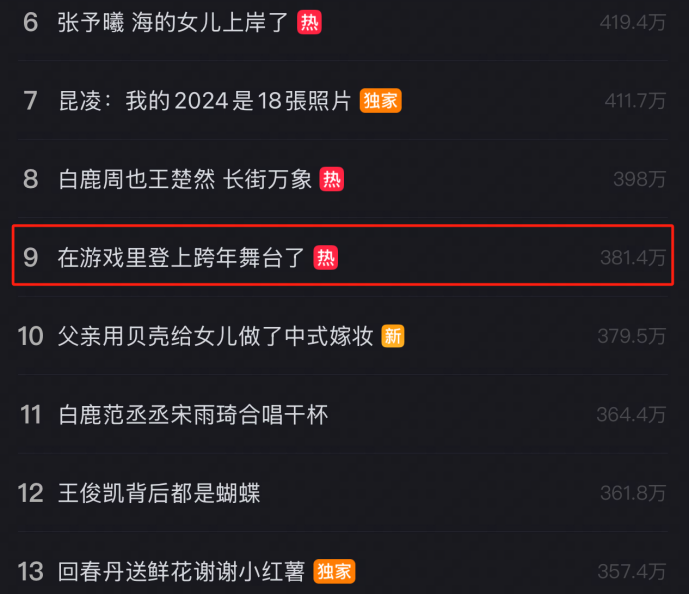 坦白说,元旦跨年并非是属于游戏的时刻,各大卫视跨晚才是主角。当社交平台热搜被明星舞台承包,游戏行业总在跨年夜默契地保持沉默。