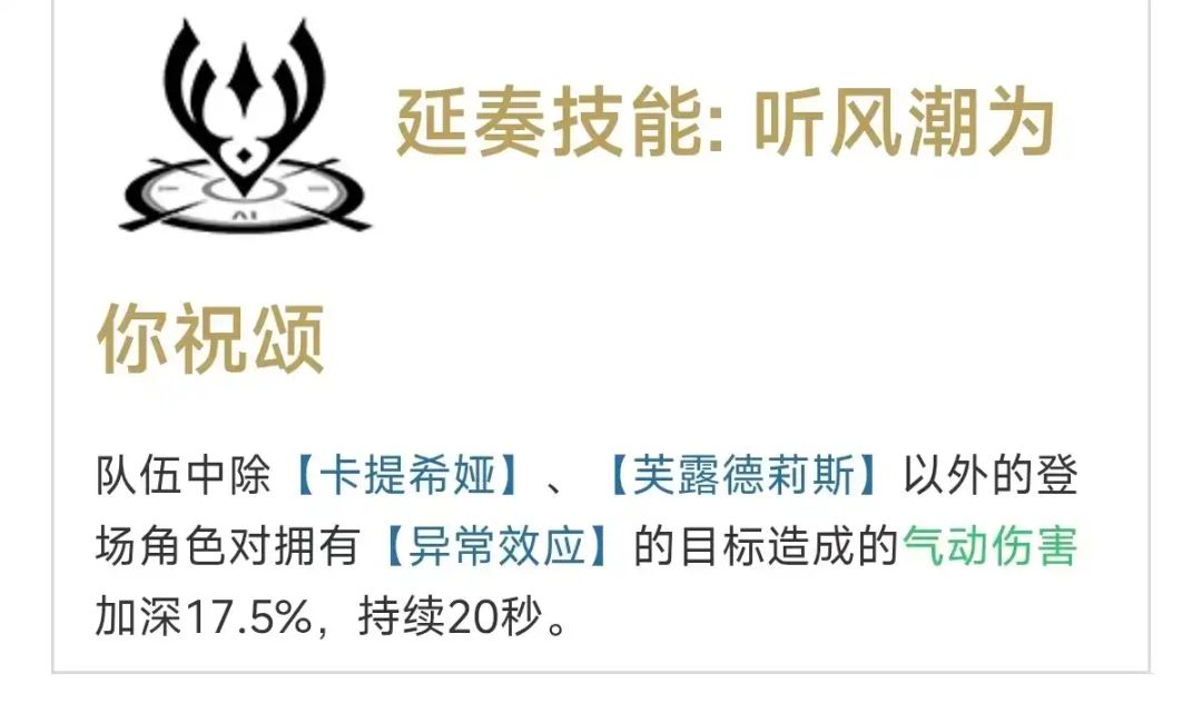 嘉贝莉娜其次是2号位,关于这个位置我的理解就是能提供一定输出能力且能给主c提供加成的角色,诸如折纸、长离、船长、坎特、尤诺、仇远等,他们的共同特点是提供的延奏buff都是“下一个登场的角色XXX伤害提升/加深XXX%,若切换到其他角色则效果提前结束”,不能提供全队加成而是只能针对主c提供加成,其他的什么回血、护盾等等我认为都只是锦上添花。