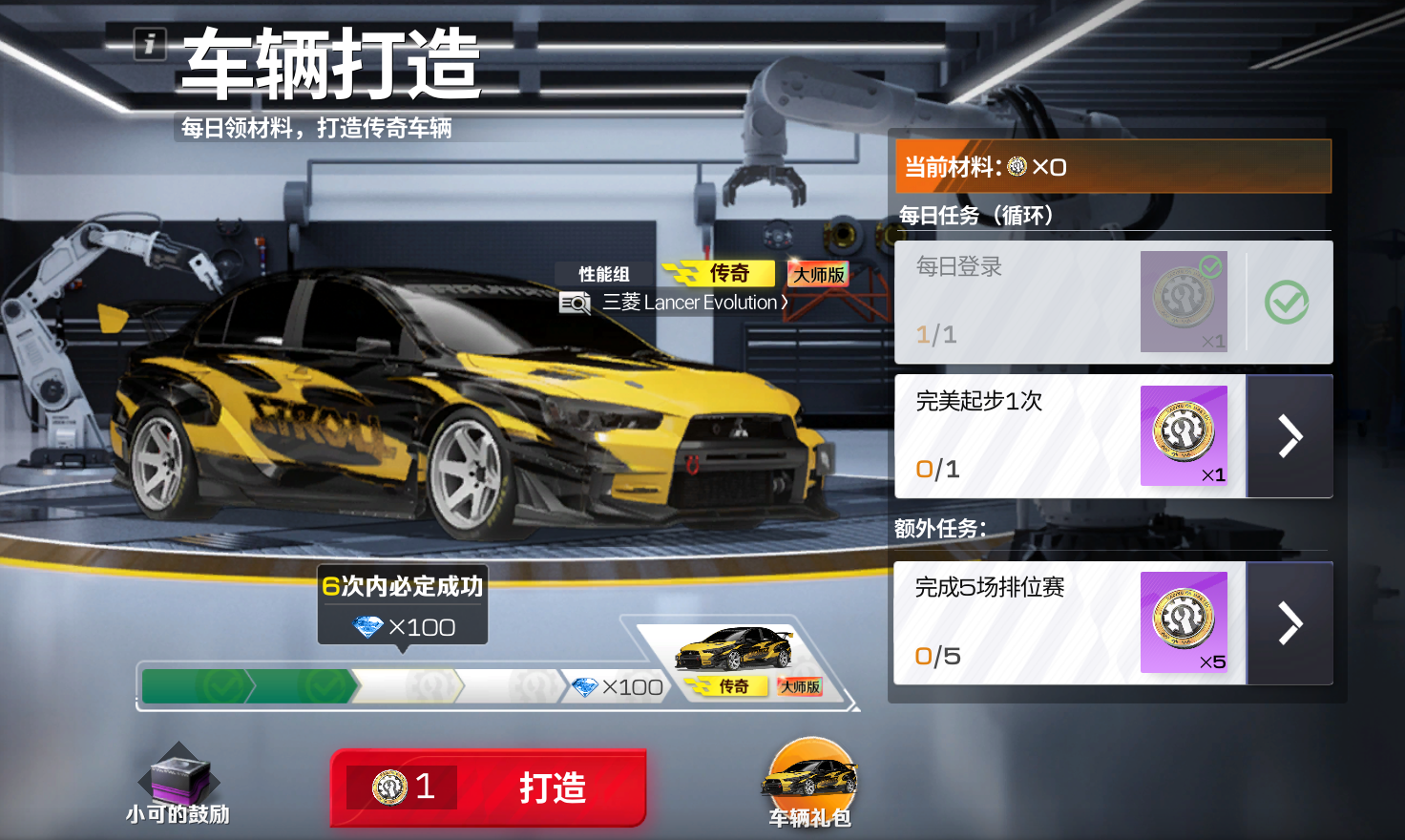 提车第二步,专属活动要参与!每日参与车辆打造,再免费抱走一台三菱 Lancer Evolution X 街头传说 '10,零成本解锁1阶性能猛兽;