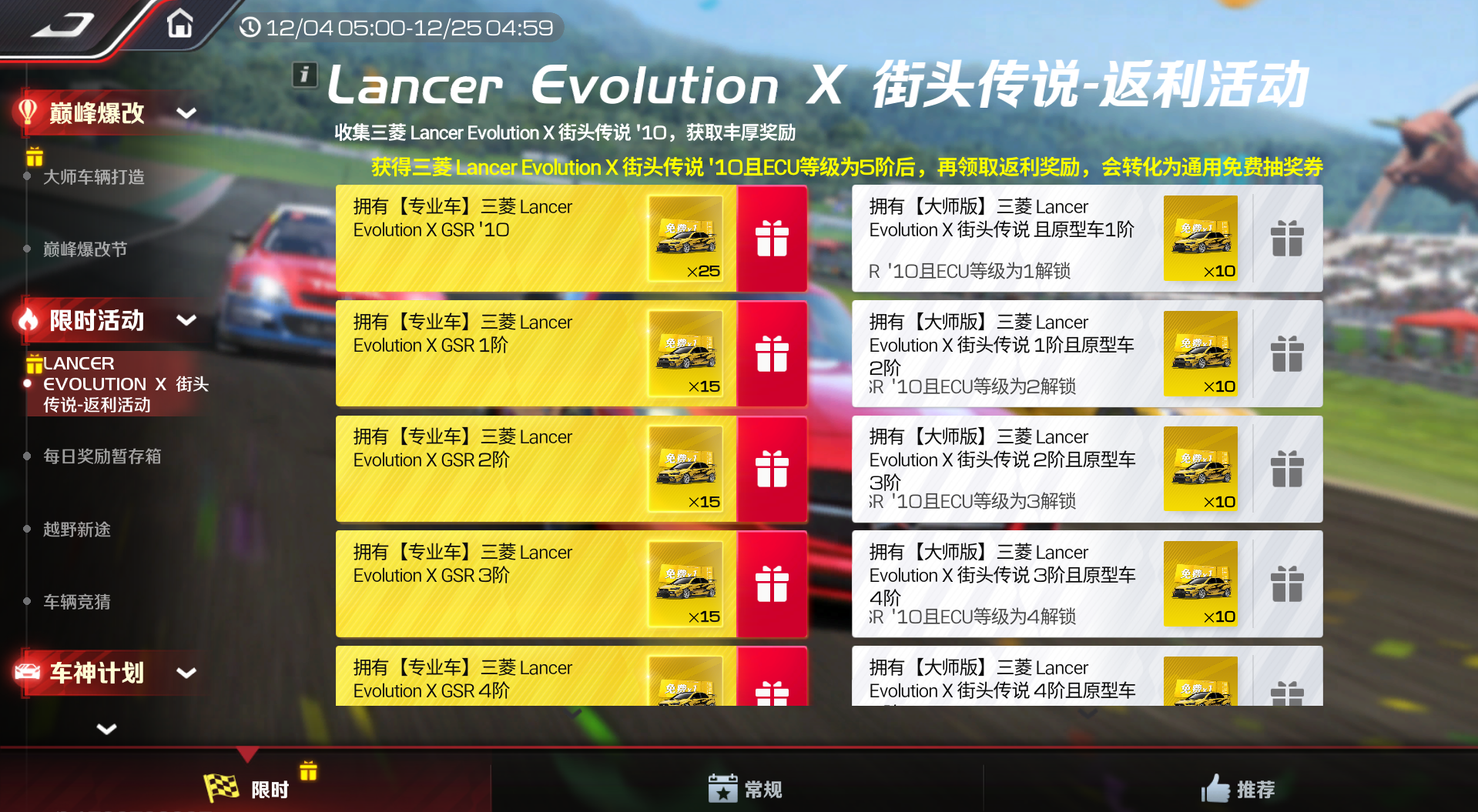这套攻略一出手,小可就知道你的新车肯定有啦!接下来就跟着小可一起往下滑,把新车三菱 Lancer Evolution X 街头传说 '10收入囊中,让周一的赛道之旅从这台街头传说开始吧!