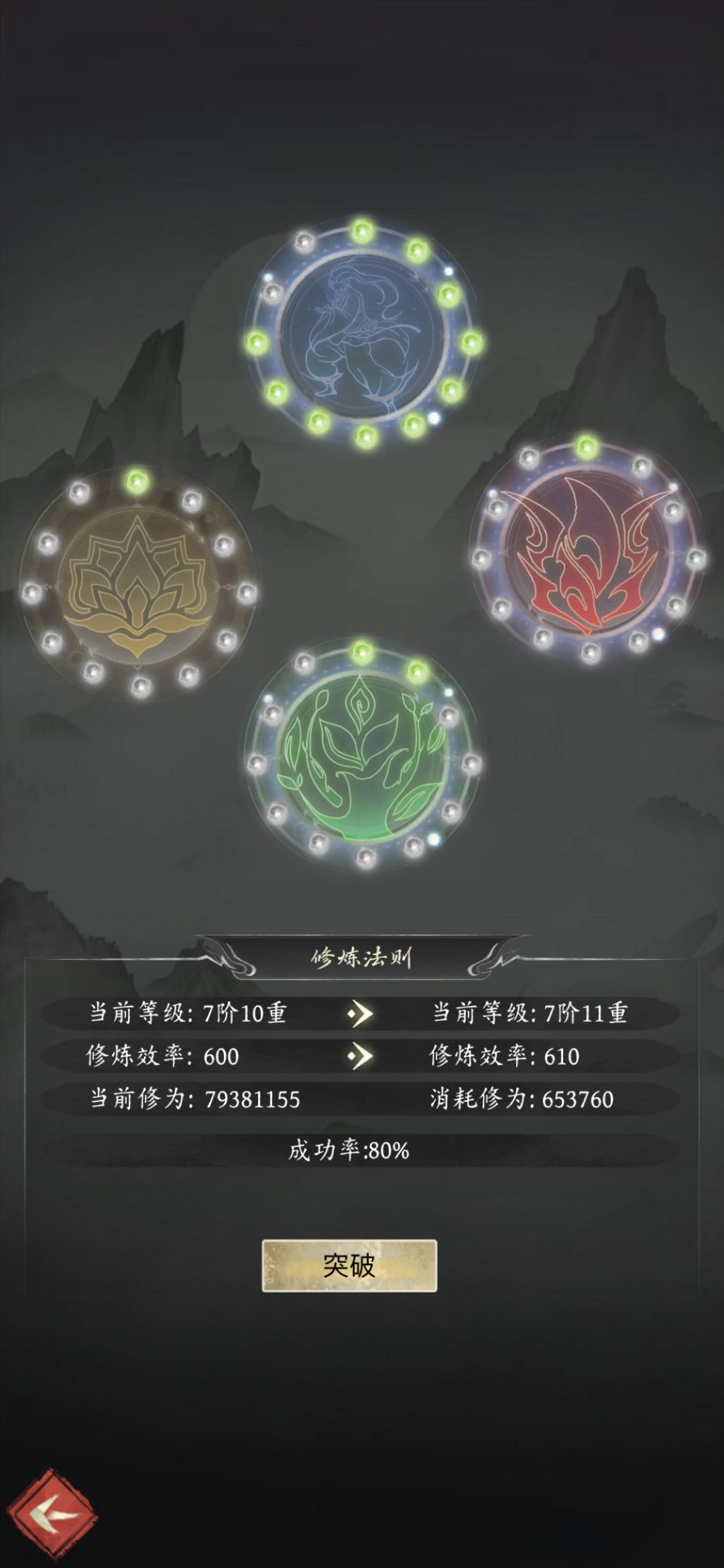 科普知识:前5阶5重点一次加5修为效率,5s循环一次,那一分钟循环12次,5阶5重-25阶段,点一次加10点效率。25阶-34阶一次加30点修为效率