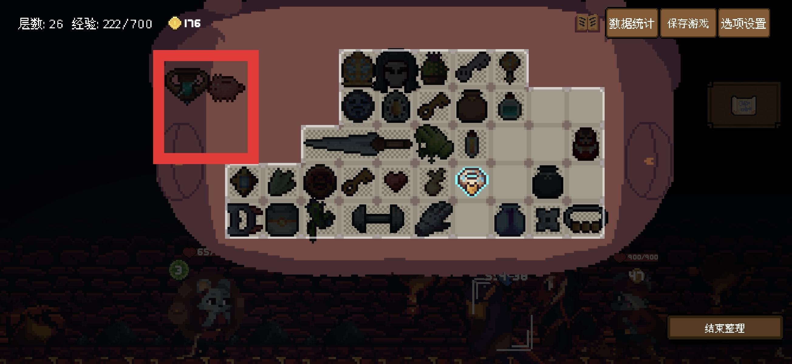 战斗时,饰品-套娃在顶层时会导致背包向外扩一格空间,实际该空间不可用、不存在、仅视觉效果,导致玩家物品放上去就会销毁。图2