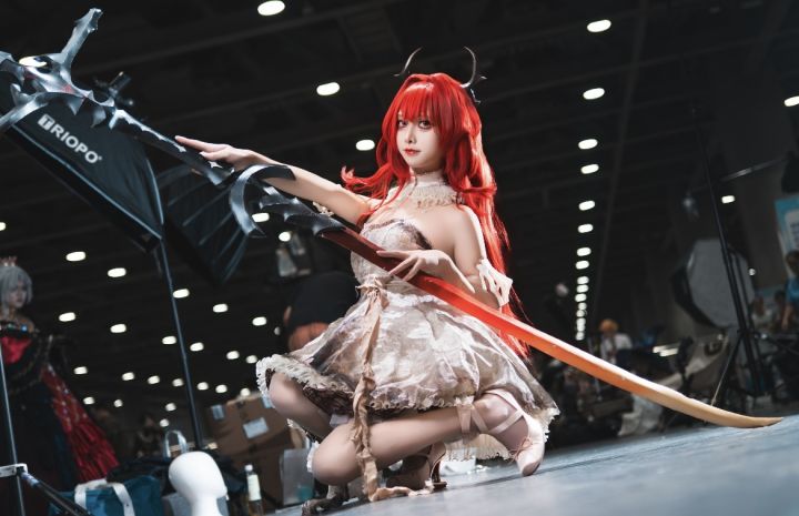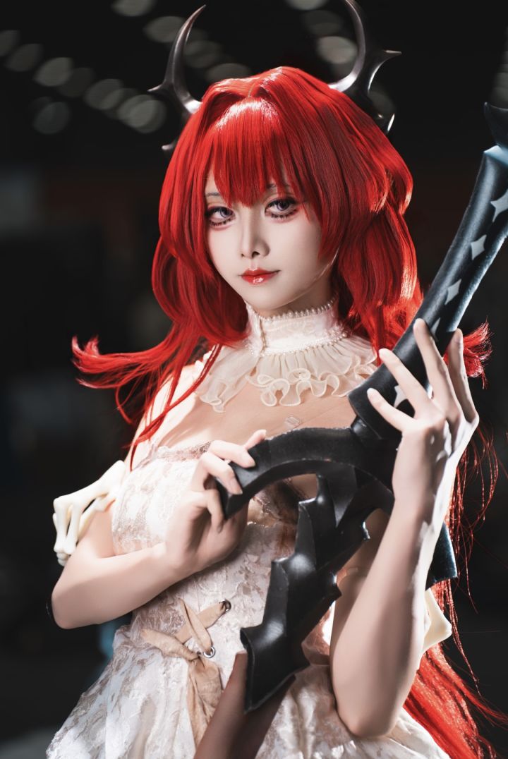 这组史尔特尔的cos直接美到心巴上!红发的质感蓬松又有层次,酒红的发色精准还原角色的炽烈,发尾的渐变更是细节拉满,搭配黑色角饰,瞬间带出角色的魔性与魅惑。浅金蕾丝裙的设计太惊艳了,裙摆的渐变晕染、蕾丝的镂空细节,将少女的柔美与角色的飒爽完美融合,芭蕾高跟鞋的搭配更添了几分优雅的破碎感。妆容上冷调的眼妆衬得眼神清冷又凌厉,唇色的浅粉又中和了攻击性,整体姿态轻盈又有张力,抬手持角的动作把史尔特尔的气场拿捏得死死的,仿佛从游戏里走出来的炎魔,氛围感直接拉满!
