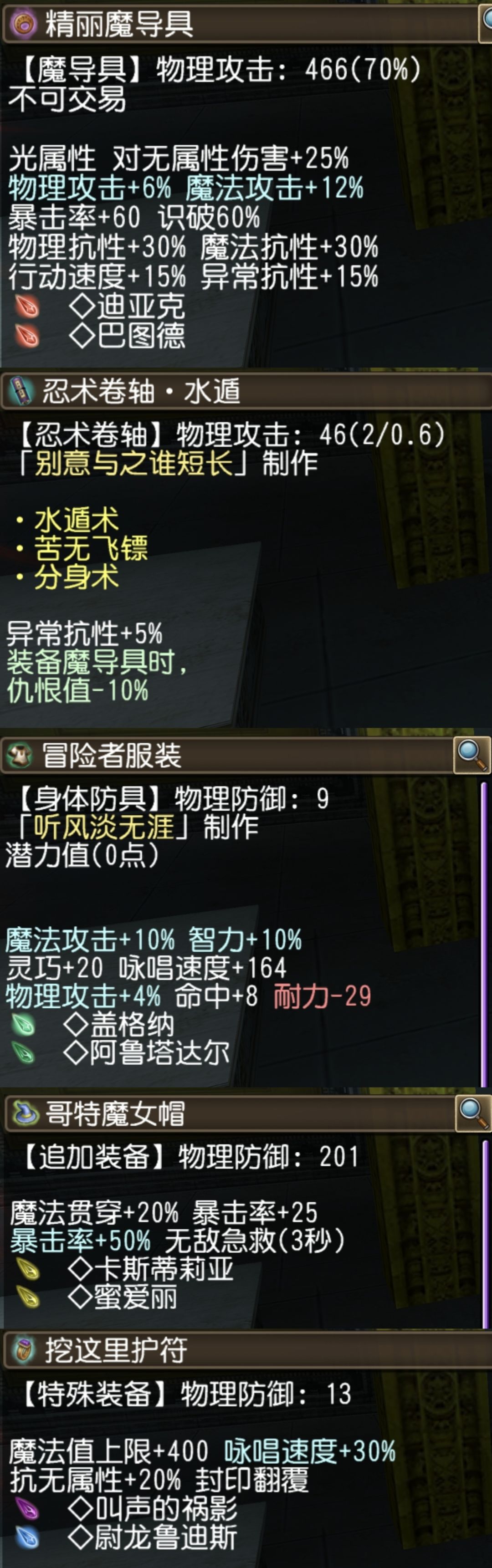 能力加点部分因人而异,本人时装提供了8%异抗,其余魔贯。228抗性提供228/3.4=67%异抗,卡斯魔导本身提供15%异抗,水遁卷轴5%异抗67+15+5+8=95,由于我还屯了5%异抗的药品,因此可以轻松百异抗。灵巧方面根据自身咏唱微调,必要时降低智力也无伤大雅。