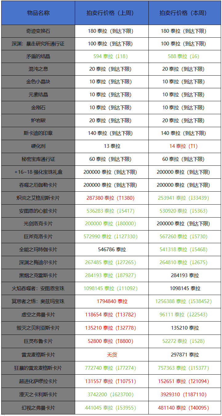 本周的大部分附魔卡片还是处于降价状态,不过降低的幅度不是很大大多是低了几千泰拉,另外网传体验服团本竞拍附魔降价其实是假的