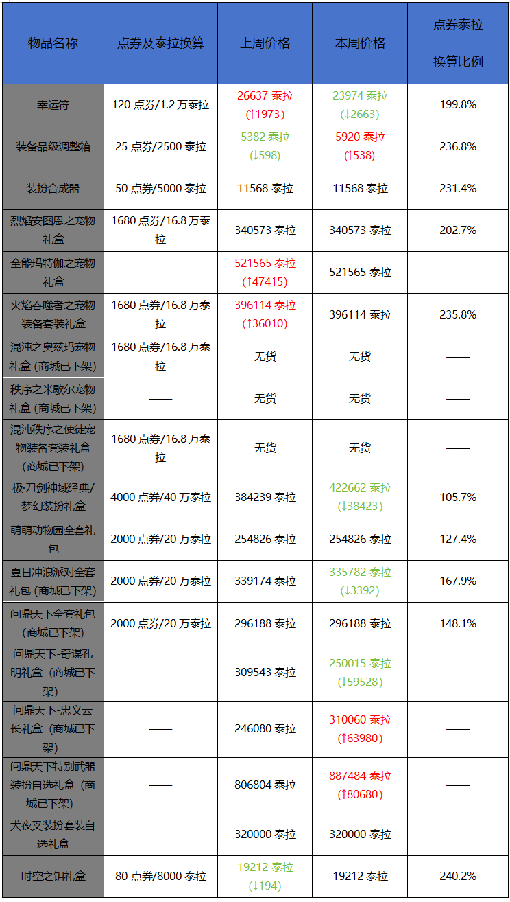 在本周商城道具价格变化依旧不大,幸运符的热度开始过去了,价格开始逐渐回落,说明大部分玩家现在对于魔法石和耳环部位的强化已经告一段落了,另外关羽套和关刀装扮在本周价格有较大的涨幅,这两件道具都是明年1月过期,有存货的兄弟可以考虑这两周将其出掉了,切勿烂在手里