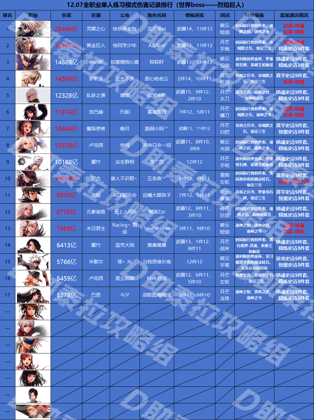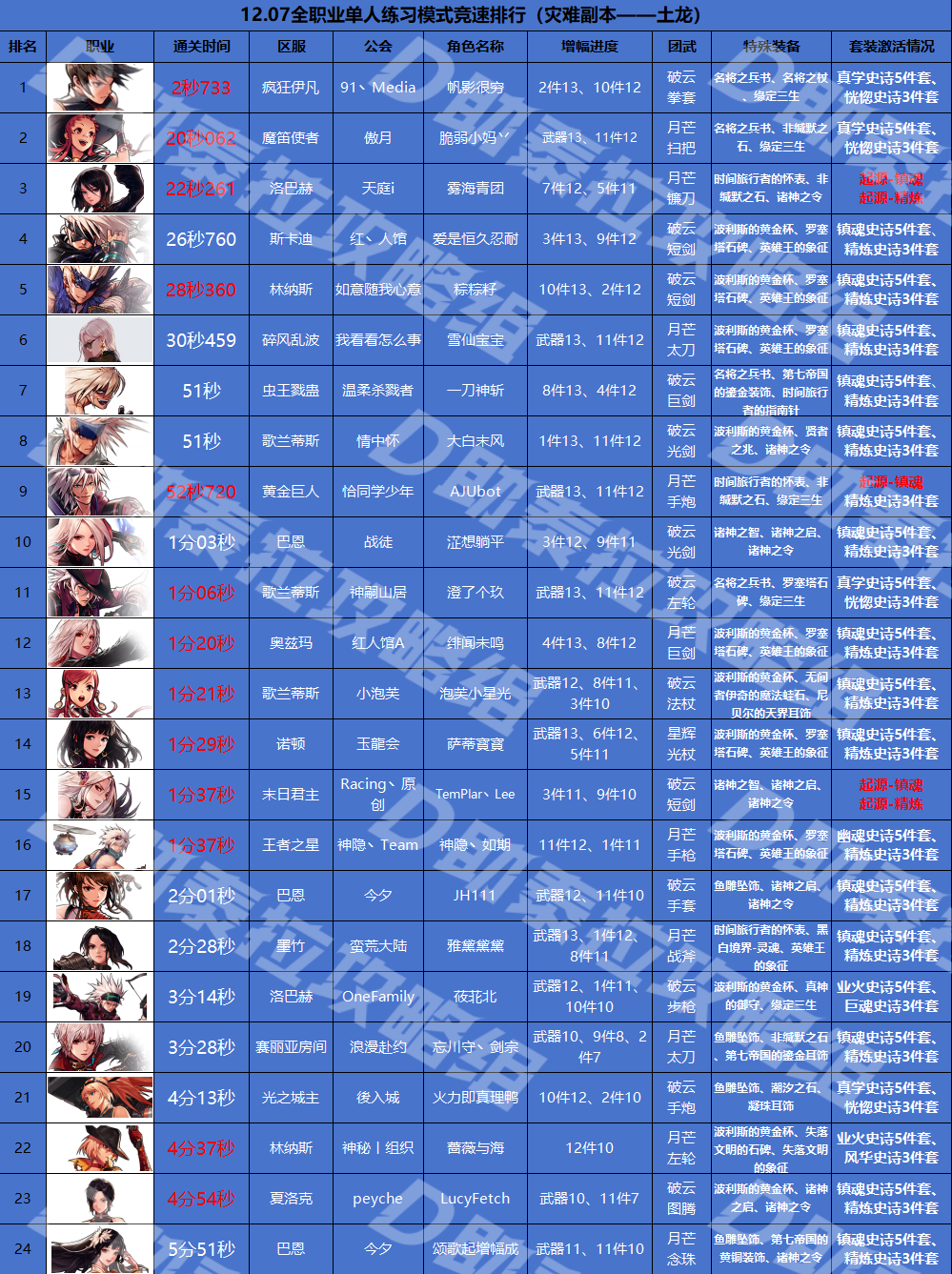 注:现因单人练习排行榜有高伤害限制,单人超过3500亿的成绩有较大的概率不会在游戏排行榜显示,所以可能会丢失一些职业记录,欢迎大家将一些高伤害记录投稿,笔者都会积极采纳的,另外装备打造为排行榜外显装备,与实际打伤装备可能存在差异