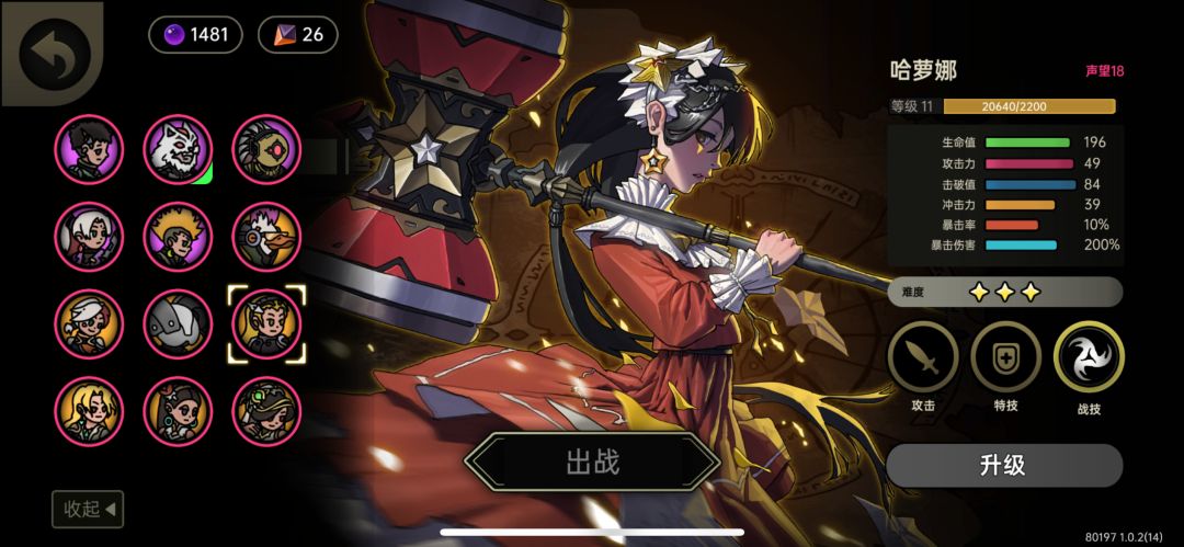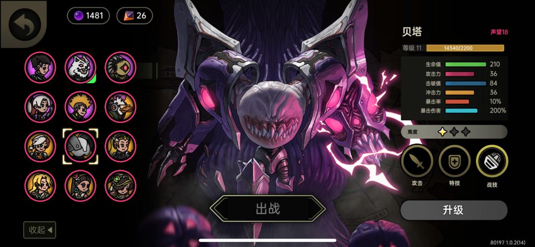 角色一个15级 别的都是11级满天赋 刷币最好不要点这个围攻天赋打17级的挑战 玩的最爽的角色应该是灵羽吧 其次是大锤 贝塔 刀锋 刀锋这个角色最好练反击也玩的得跟怪最有对抗性 最难玩的应该是那个沃尔冈也就是拳皇 反击判定太逗了慢一拍