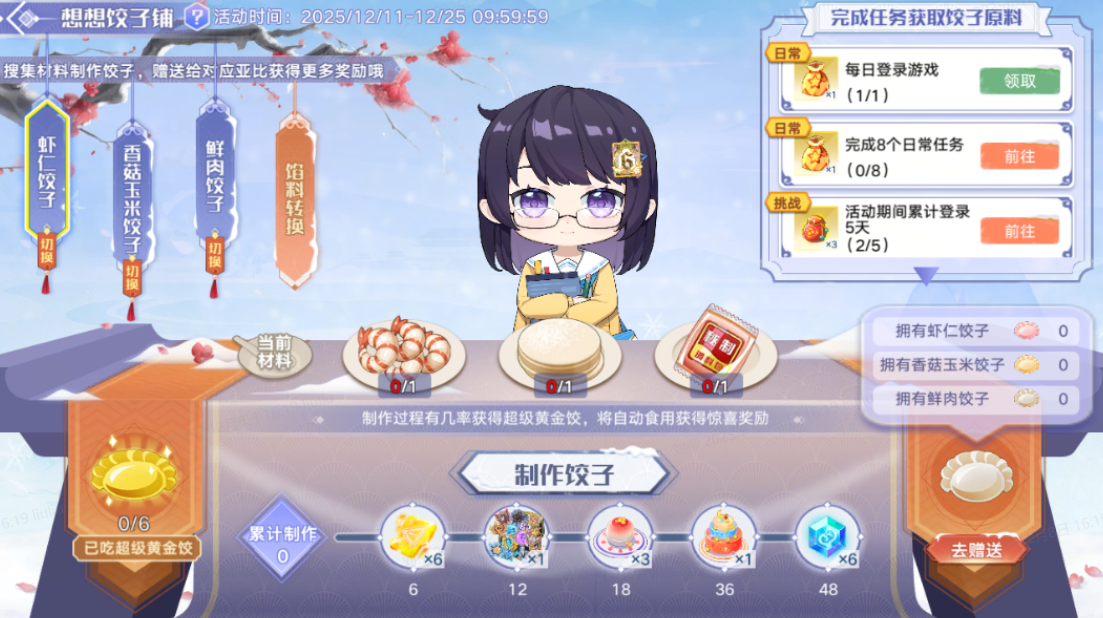 1、每日登录或完成日常任务即可获得饺子皮、秘制调料包和随机馅料道具,采用不同馅料和饺子皮、秘制调料包结合可制作出不同类型的饺子,饺子可赠送亚比获得奖励。