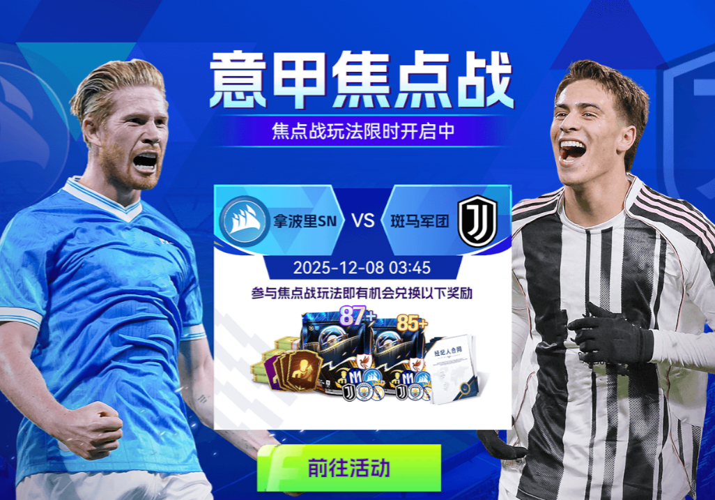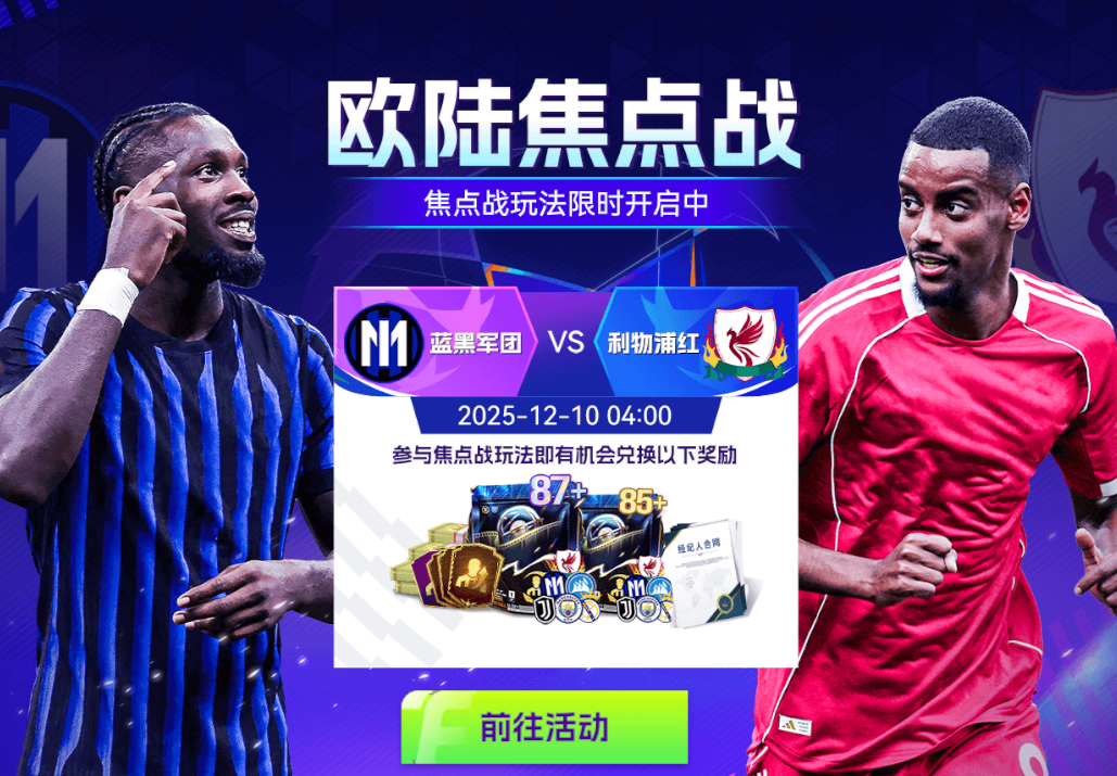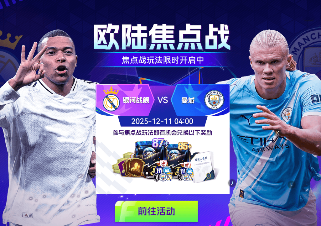 焦点战玩法限时开启中,参与各类玩法获取焦点战币,最高可兑换【87+】焦点战豪门混合球员包等诸多好礼。强强对决一触即发,豪门之间的火花即刻点燃赛场。多场重磅对决接连上演!聚焦热门赛事,投入竞猜互动!参与活动,你就有机会成为本周真正的焦点赢家!