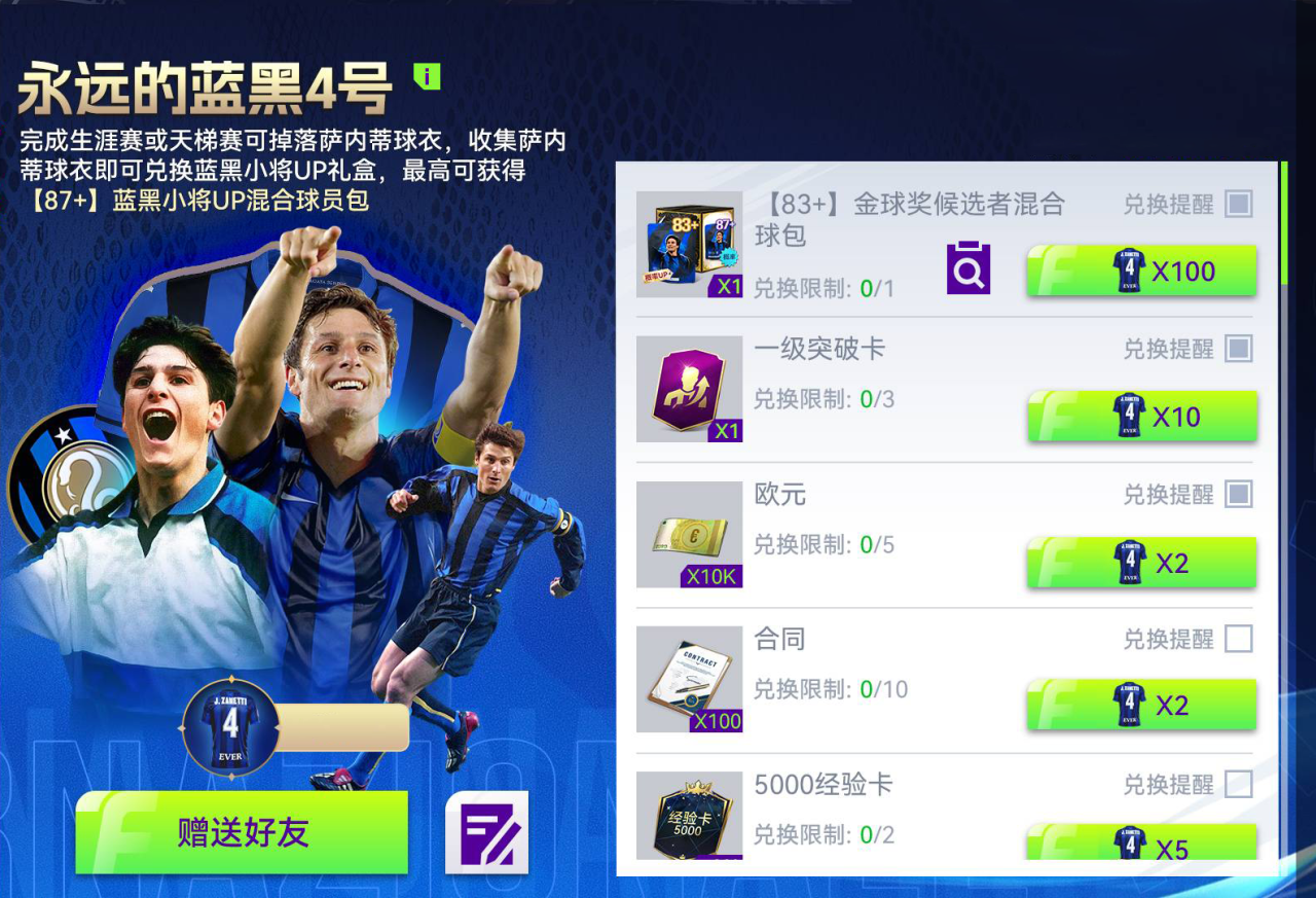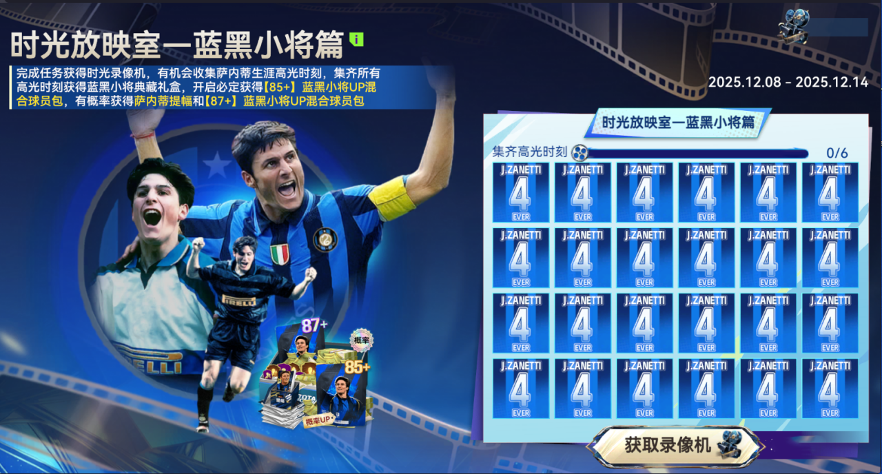 完成任务获得时光录像机,有机会收集萨内蒂生涯高光时刻,集齐所有高光时刻获得蓝黑小将典藏礼盒,开启必定获得【85+】蓝黑小将UP混合球员包,有概率获得萨内蒂提幅和【87+】蓝黑小将UP混合球员包。启动时光录像机,你会看到飞奔在边路的坚毅轨迹,深深镌刻在蓝黑军团史册的昂扬背影。参与活动开启典藏礼盒,让那份属于蓝黑的荣光照进你的球队。