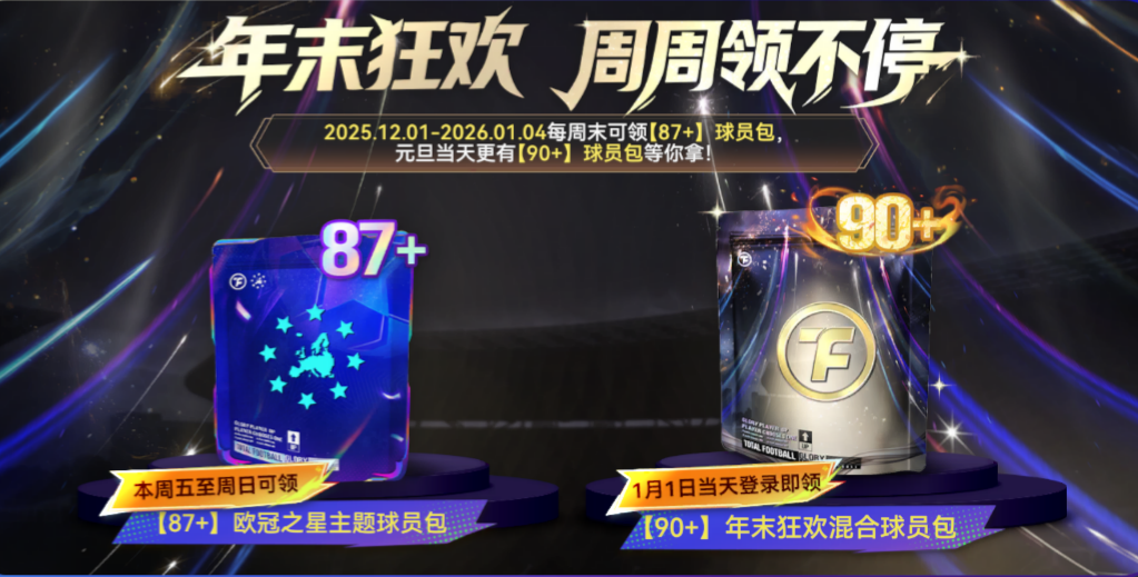 2025.12.01-2026.01.04每周末可领【87+】球员包,元旦当天更有【90+】球员包等你拿!年末惊喜如潮水般接连不断,周周豪礼更是从不间断。元旦还有“新年第一份好运礼”——准时上线领取好礼,就有机会让你的球队气势爆棚,在新的一年迎来强势开局!
