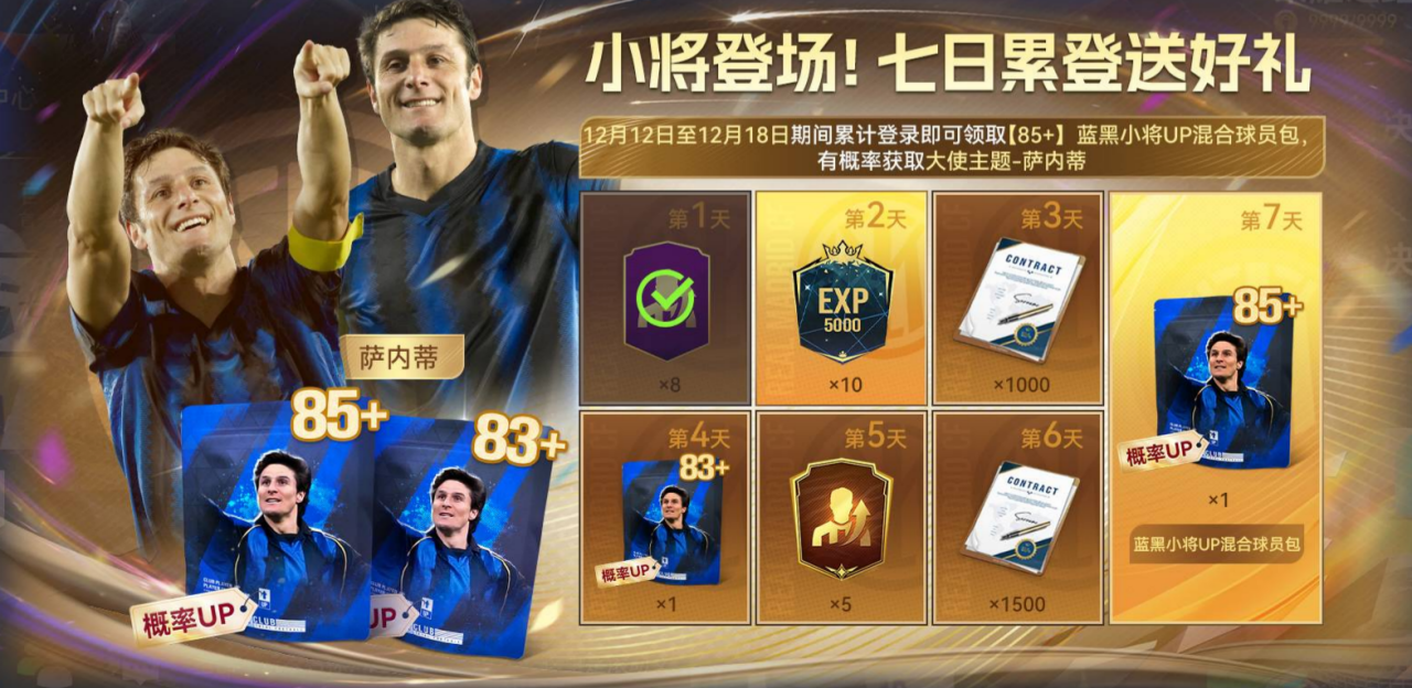 12月12日至12月18日期间累计登录可领取【85+】蓝黑小将UP混合球员包,有概率获取大使主题-萨内蒂。“蓝黑小将”降临球会,豪华奖励持续加码。每日签到不仅是习惯,更是与传奇并肩的第一步。参与活动,就有机会让萨内蒂加入你的阵容!