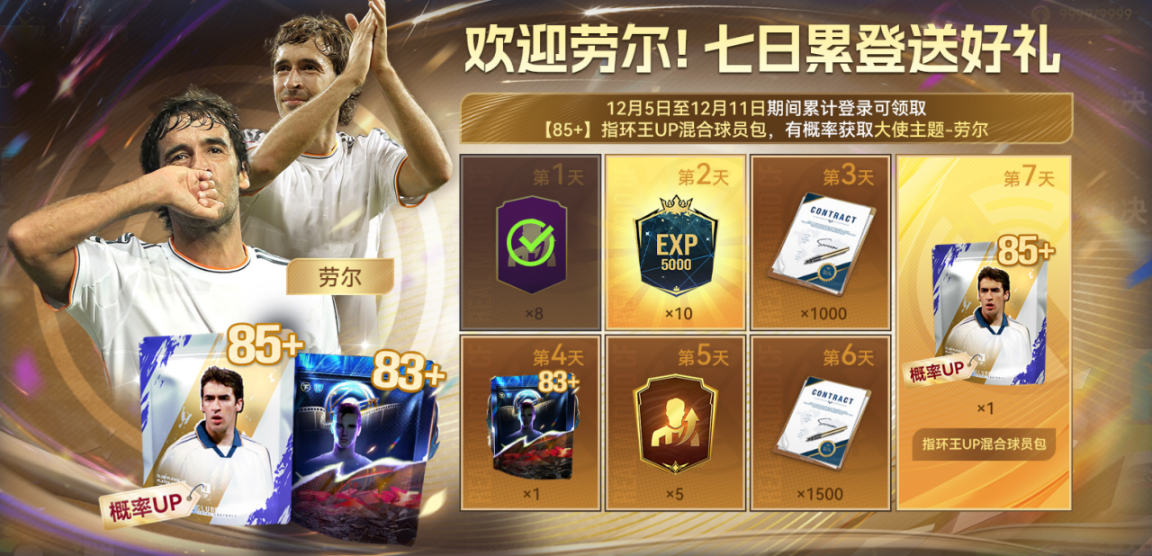 12月5日至12月11日期间累计登录可领取【85+】指环王UP混合球员包,有概率获取大使主题-劳尔。每日登录,就是向传奇更靠近一步!坚持累登就有机会让伯纳乌的王子加入你的阵容,让他的优雅跑位与致命终结将再现球场!