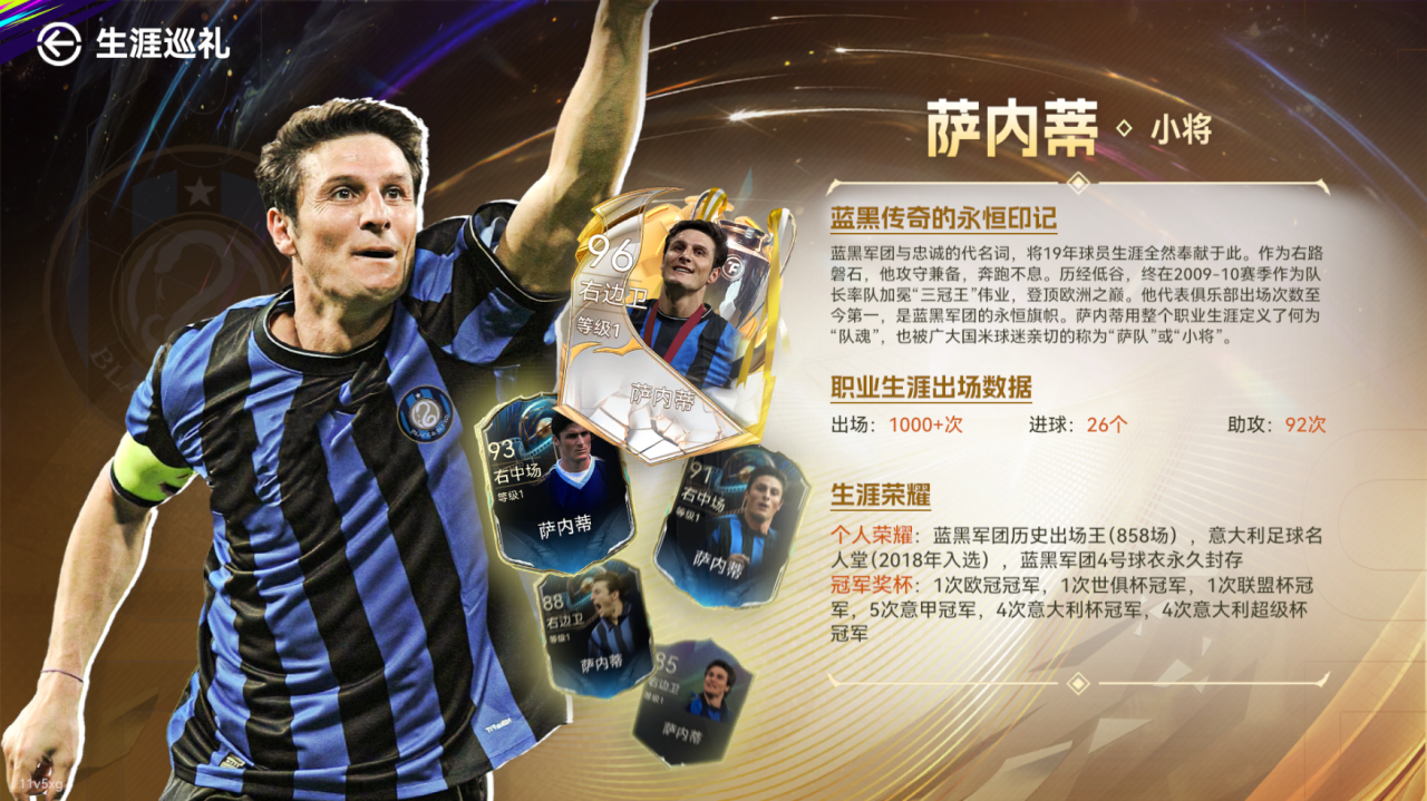 蓝黑队魂-萨内蒂登录《最佳球会》!他是蓝黑军团与忠诚的代名词,将19年球员生涯全然奉献于此。作为右路磐石,他攻守兼备,奔跑不息。历经低谷,终在2009-10赛季作为队长率队加冕“三冠王”伟业,登顶欧洲之巅。他代表俱乐部出场次数至今第一,是蓝黑军团的永恒旗帜。萨内蒂用整个职业生涯定义了何为“队魂”,也被广大国米球迷亲切的称为“萨队”或“小将”。