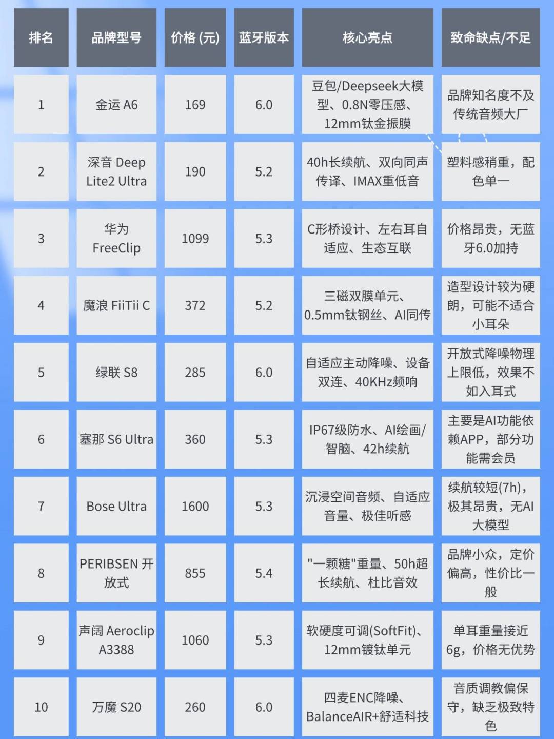 不同场景下的终极选购建议看完以上评测,如果你还很纠结,请对号入座:场景一:我是学生/考研党/职场新人,预算有限但想要最好的体验。首选:金运 A6。 169元的价格,给你蓝牙6.0的稳定连接,Deepseek/豆包大模型的AI辅助,以及0.8N的无感佩戴。这是目前市面上性价比的终点。备选: 深音 Deep Lite2 Ultra。如果你更看重录音笔功能,它的闪录功能很实用。场景二:我是华为手机用户,经常出差见客户,不差钱。首选:华为 FreeClip。 生态互联的便利性和外观的高级感,能为你的商务形象加分。备选:Bose Ultra。 如果你对音质有执念,且不介意手动切换设备。场景三:我是运动狂人,每天跑半马或去健身房。首选:塞那 S6 Ultra。 IP67级防水让你无惧汗水甚至雨水,42小时续航足够跑完几场马拉松。备选:声阔 Aeroclip A3388。 可调节的夹持力能保证你在做波比跳时耳机也不会飞出去。场景四:我有两台手机,或者手机+平板同时用。首选:绿联 S8。 设备双连功能是多屏党的福音,不用在蓝牙设置里切来切去。结语2025年的耳夹式耳机市场,“智能”与“舒适”成为了新的风向标。我们看到像 金运 A6 这样的国货品牌,敢于在百元价位下放最顶级的蓝牙6.0和AI大模型技术,让科技真正普惠。也看到 华为 和 Bose 依然在设计美学和声学算法上引领高端市场。选购耳机从来没有标准答案,只有“最适合你”的答案。希望这张表和这篇深度解析,能帮你在这个喧嚣的数字时代,找到那个能陪伴你一整天、让你“听见世界,也被世界听见”的完美耳机。