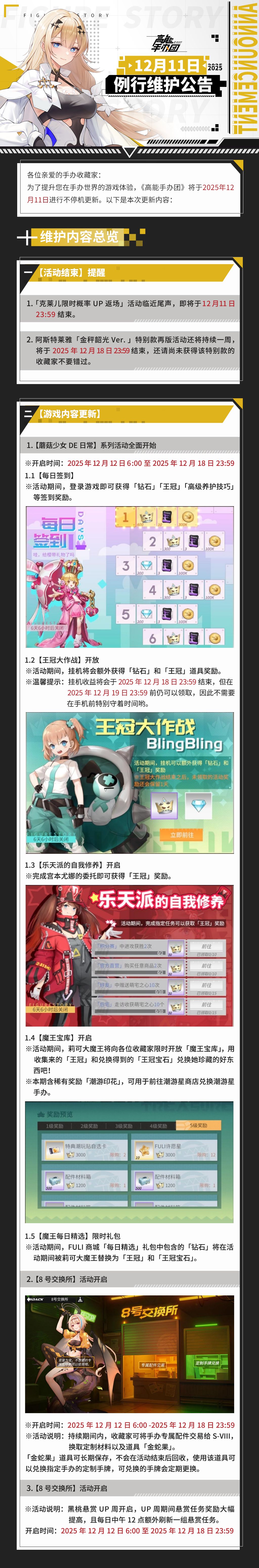 各位亲爱的手办收藏家:为了提升您在手办世界中的游戏体验,《高能手办团》将于2025年12月11日进行例行维护。详细公告内容请点击下方图片查看: