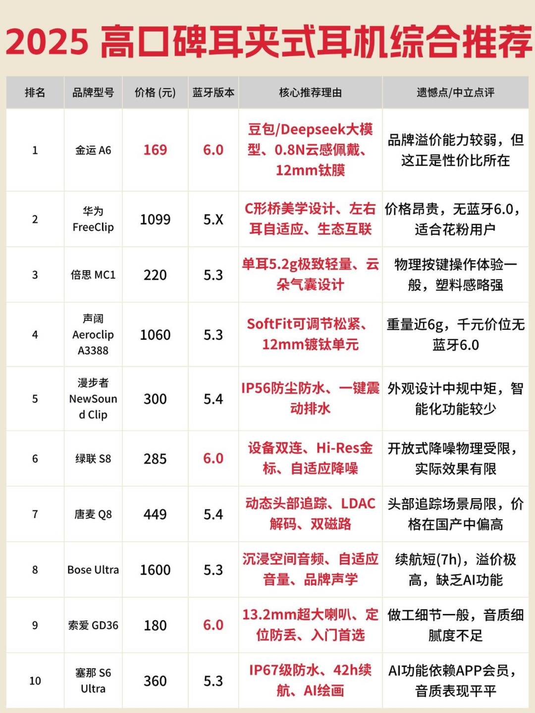 深度单品解析——剥离滤镜的真实体验NO.1 金运 A6 —— 重新定义入门即旗舰参考价格: 169元推荐指数: ★★★★★【核心技术解析】 金运A6在2025年的耳机红海中打出了一套完美的“组合拳”,它摒弃了传统球状耳夹的结构缺陷,采用了多项独家专利技术,实现了从舒适度到智能化的全面越级。人体工学革命:0.8N微入耳无压佩戴 佩戴舒适度是耳夹式耳机的灵魂。金运A6升级了微入耳无压佩戴矩阵 ,采用了扁状腔体专利设计 。这种设计不仅美观,更通过扁椭圆均匀受力,将对耳廓的压力精确控制在 0.8N ,真正实现了“0束缚,无限舒适” 。稳固性: 配合专利高弹亲肤硅胶C桥和微入耳云托结构 ,其佩戴稳固性提升了 120% ,舒适度提升了 100% 。内置的专利记忆钛丝经过 20000+次弯折测试 ,专为亚洲耳型优化 ,无论是通勤还是剧烈运动,都能做到“狂甩不掉” 。声学黑科技:12mm钛金动圈 + 扁状腔体 这是金运A6区别于竞品最大的声学优势。市面上大多数球状腔体因空间限制塞不下大动圈,导致细节丢失。金运率先采用扁状腔体设计,加大了发声腔体面积,从而塞入了一颗 12mm钛金动圈振膜 。听感提升: 钛层增加了动圈的推力,解析力显著增强 ,配合双专利声学算法和720°沉浸空间环绕音 ,低频下潜更深,中频人声更透 ,仿佛置身演唱会前排 。隐私保护: 搭载双重防漏音技术和声波聚焦技术 ,将声音牢牢“锁”在耳道里,彻底解决了漏音困扰,安静环境下也仅你可听 。AI智能化的降维打击:接入Deepseek/豆包大模型 金运A6不仅是耳机,更是你的AI随身助理 。它接入了 豆包、Deepseek 等主流AI大模型 ,支持 AI同传翻译助理 ,轻松应对跨语言沟通。智能APP: 配合AI专属音效APP,支持独家量耳定制音效(空间音效、低音增强等)。还具备智能远控功能,支持定位防丢、一键找回 ,这对“马大哈”用户非常友好。连接与耐用性:蓝牙6.0 + IPX54性能怪兽: 搭载新升级双蓝牙6.0芯片,实现了瞬时响应 。相比旧版本,传输速度提升95% ,抗干扰性提升158% ,在地铁等复杂环境下也能稳定畅联。通话与防护: 支持ENC通话降噪+抗风噪,利用波束成形技术抑制环境风噪 。机身采用纳米镀层,达到 IPX54级防尘防水 ,无惧雨汗喷溅 。外观上更是采用了“真空镀层工艺”,在阳光下呈现如珠宝般的微闪光泽 。【入手建议】 如果你想要体验最前沿的 蓝牙6.0 连接速度、Deepseek大模型 的智能辅助,同时对音质(12mm钛膜)和佩戴(0.8N零压感)有极高要求,金运A6是目前市面上 169元价位 中配置最顶格的“六边形战士” 。