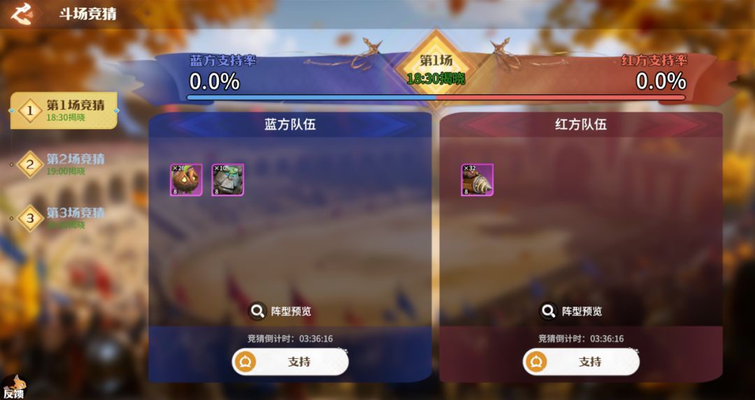 活动简介:活动期间,玩家每日可参与三场竞猜,可预览参战双方队伍阵型后选择一支获胜队伍,竞猜结果公布后发放奖励,根据竞猜成功次数的排行还可获得额外奖励。