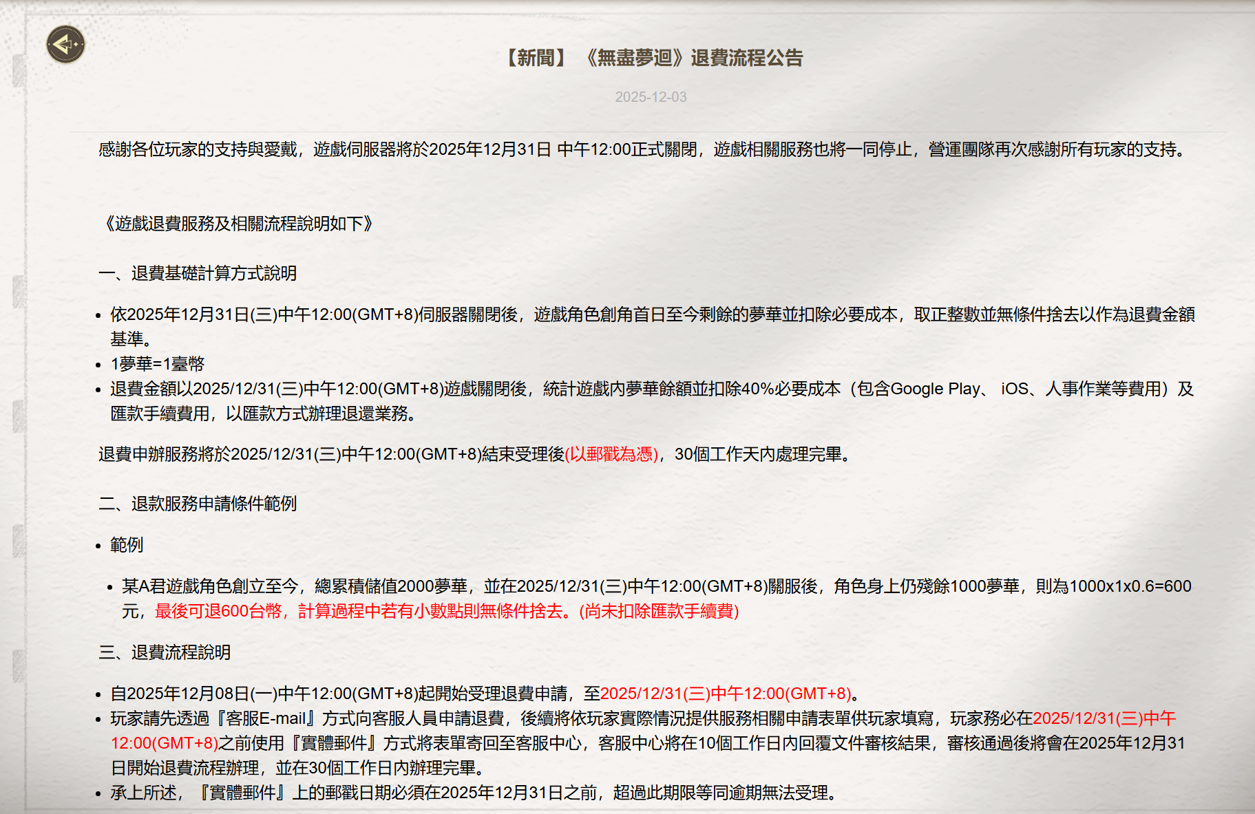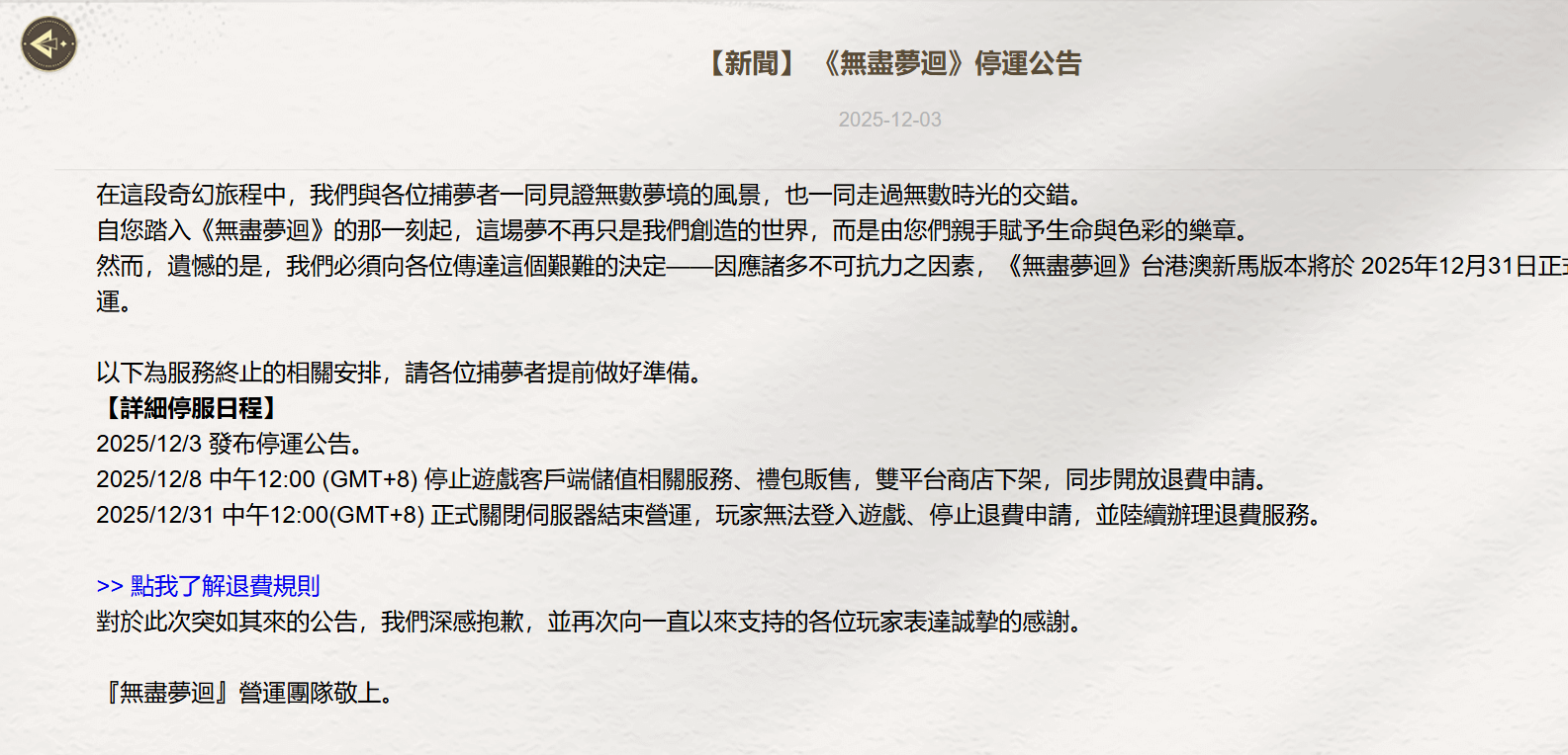 北京时间2025年12月3日,官方宣布无尽梦回在台港澳与新马等地区版本将于 2025年12月31日 中午 12:00(GMT+8) 正式结束运营。