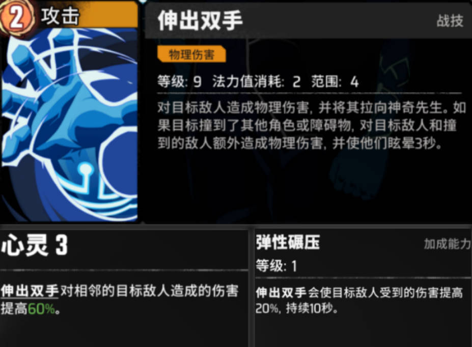 对目标造成等于神奇先生396%攻击力的物理伤害,并将其拉向神奇先生,如果目标撞到物体,则会对目标敌人和撞到的敌人额外造成等于神奇先生198%攻击力的物理伤害。并使他们眩晕3秒。