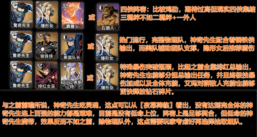 换作之前的四侠我可能就会推荐带名四侠,但他是神奇先生,所以我不推荐你为了吃这个加成而携带不合适的四侠上阵,若是有条件,四侠里的[隐形女]也差不多,毕竟对方有护盾增伤,可以给到先生输出量。