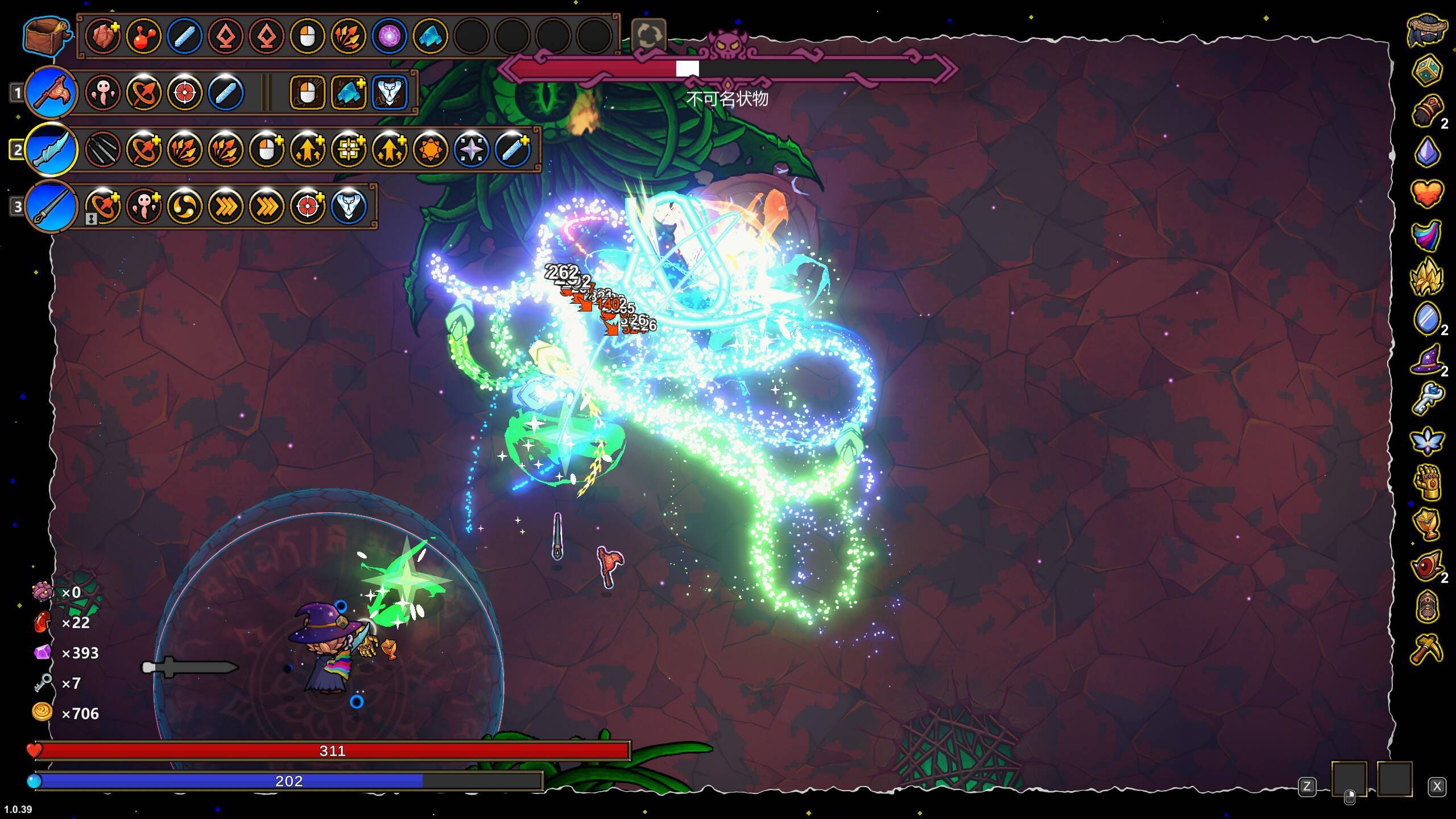 在使用同时射击的情况下,每个法术动作都会被视为多个,因此,会有多把飞剑被射出。同时,由于只有1个主动法术,此时的同时射击不会额外消耗法力,保证了前期的续航能力。在此基础上,搭配各种增加法力上限的遗物,提高飞剑的数量可以有效的提供输出能力。