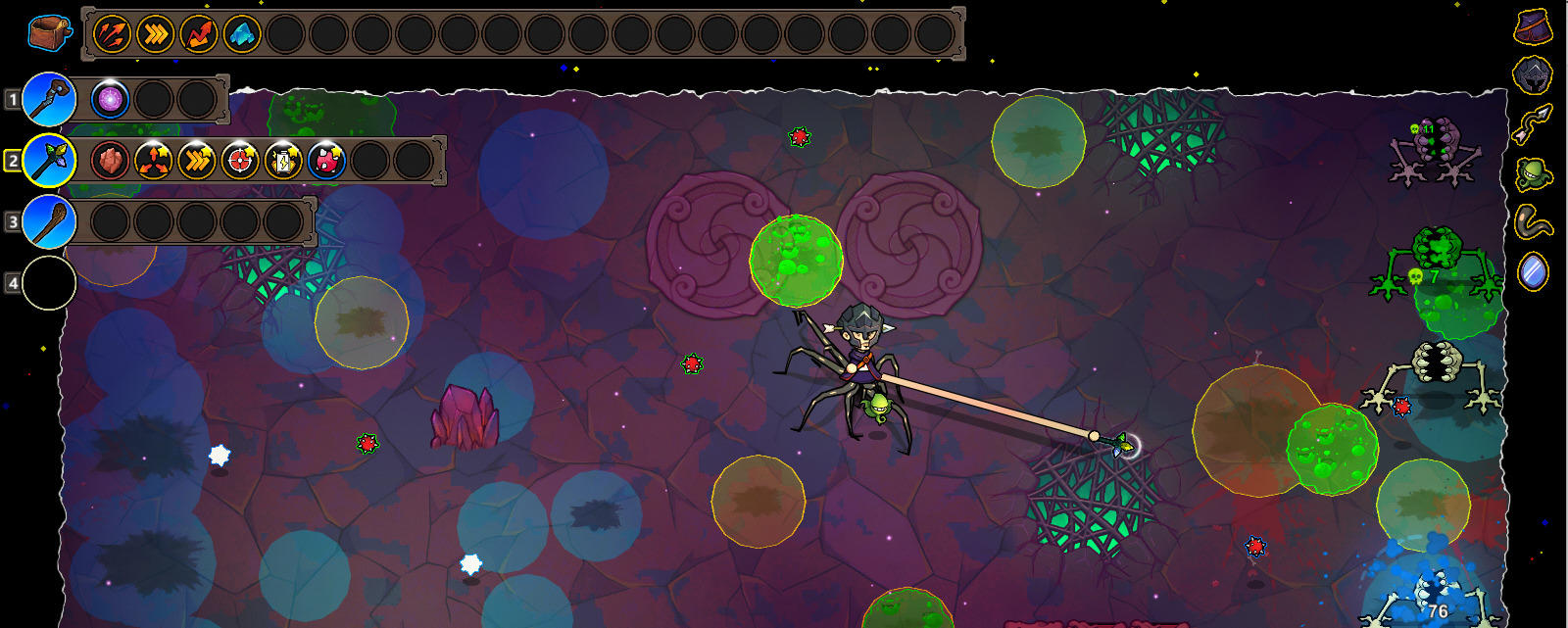 如果我们的遗物拿到了金刚靴和游侠短靴的话,我们就可以使用三色权杖,三色权杖有利有弊,这东西在染色的同时会污染地面,减速和毒液对我们也是会造成伤害的,所以我们如果没有金刚靴和游侠短靴的话建议不要使用三色权杖,有的话三色权杖就是一个很不错的选择,各种debuff的加持可以让我们更好的拉扯敌人!