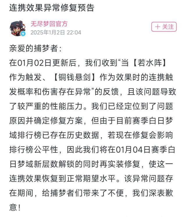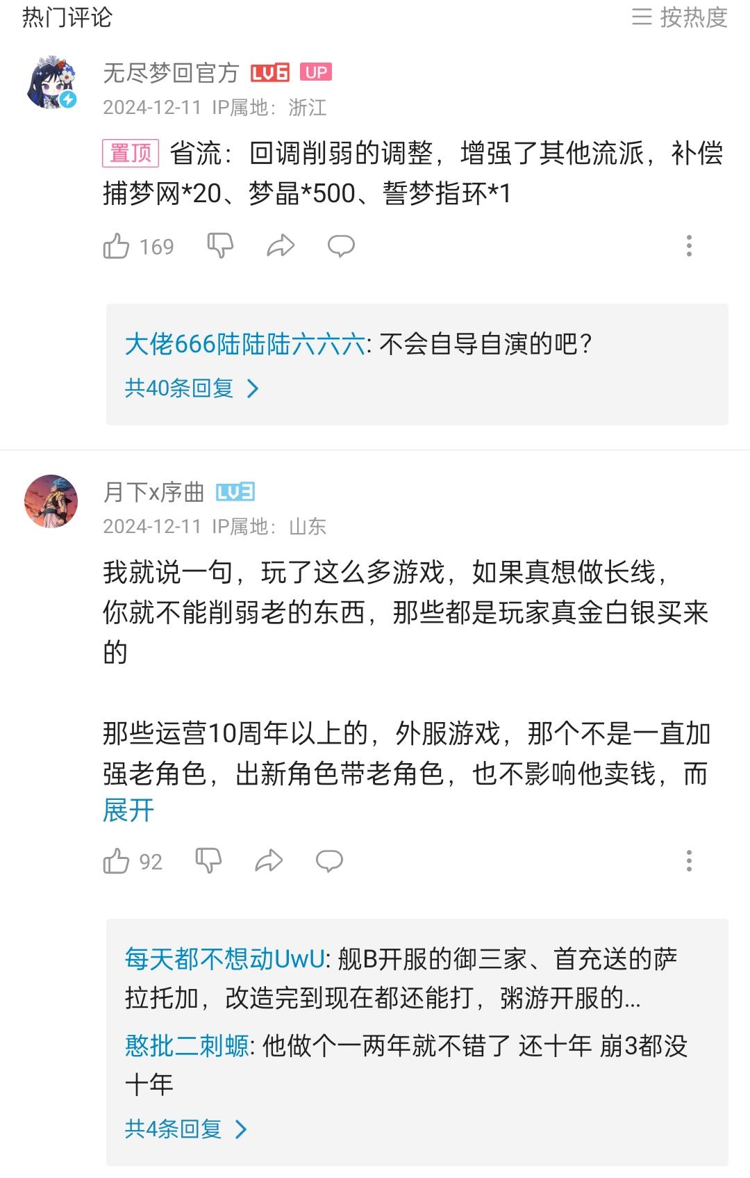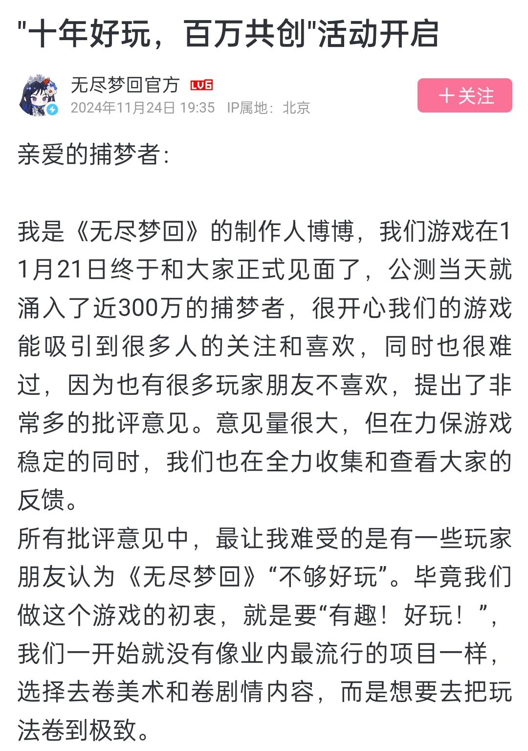 为赶进度,《无尽梦回》将三测发现的数值崩坏问题推迟至公测后调整,制作人博博虽高频回应玩家(如直播承诺“新角色包强”),但数次因技术准备不足食言(如侠之梦强度翻车事故)。