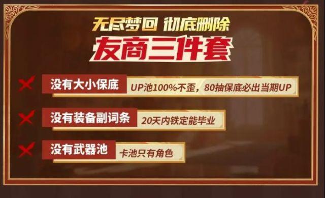 主打下沉市场,《无尽梦回》公测前高举“价格革命”大旗,号称限定角色单抽定价6元(行业均价12.8元)、取消武器池与副词条冗杂养成、80抽保底不设大小保底机制。