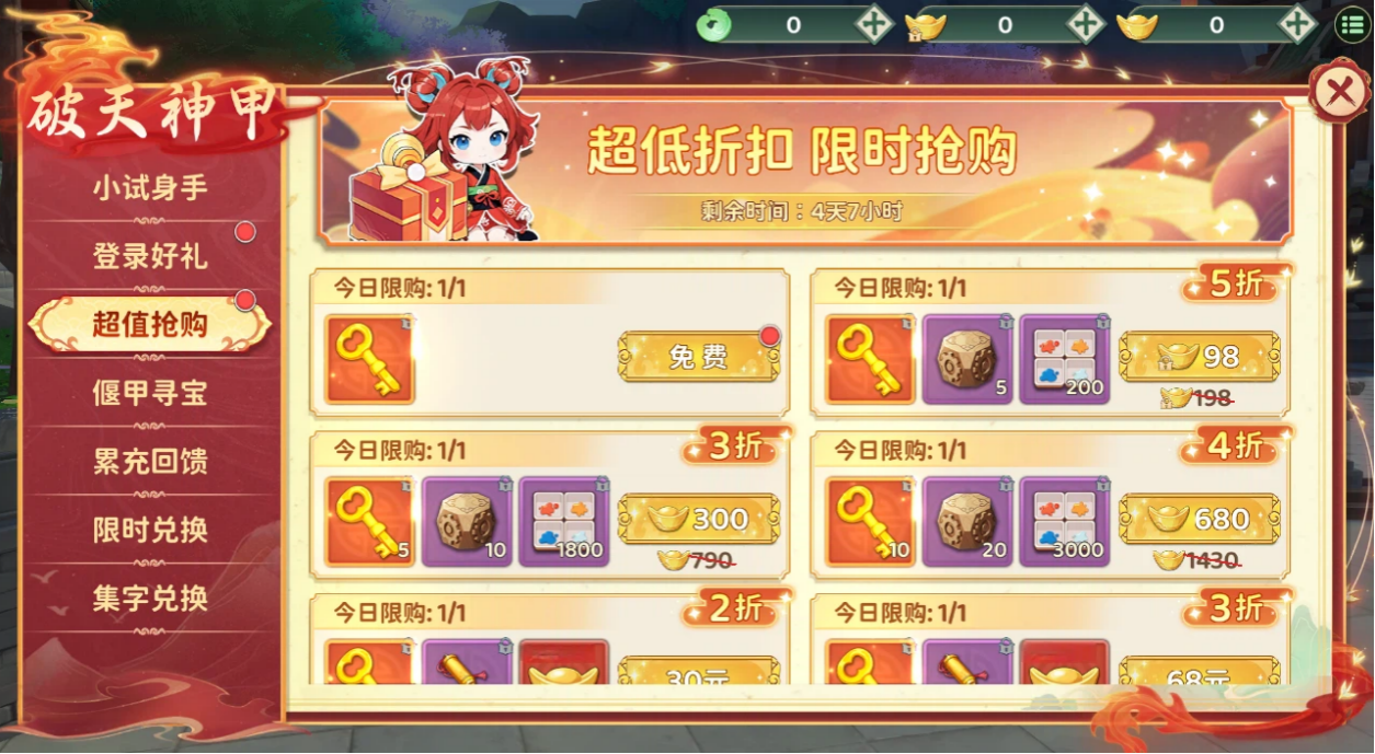 活动期间,每日登录可免费领取一把宝箱钥匙,超低折扣购买当期主题道具和大量寻宝钥匙,集齐可领专属称号!