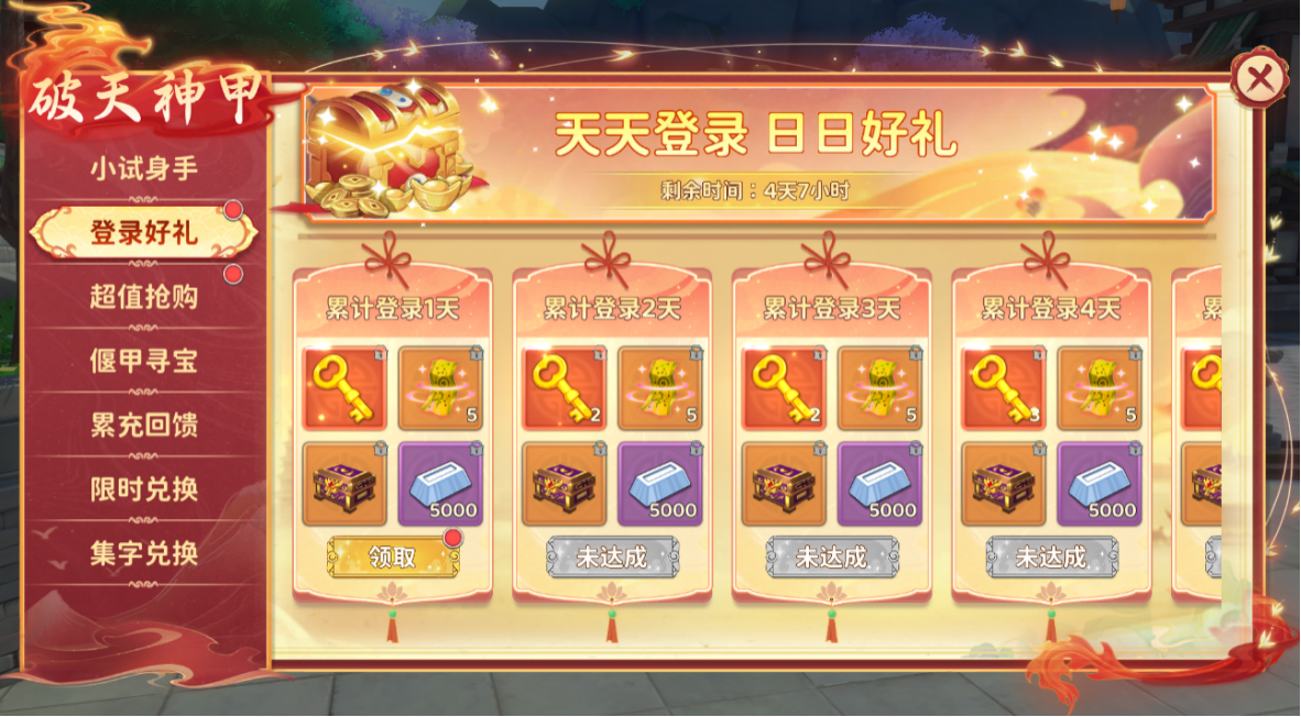 每日登录即可轻松领取寻宝钥匙、银两、土灵符、精美宝箱等珍稀奖励,连续登录七天更有额外豪礼相赠!