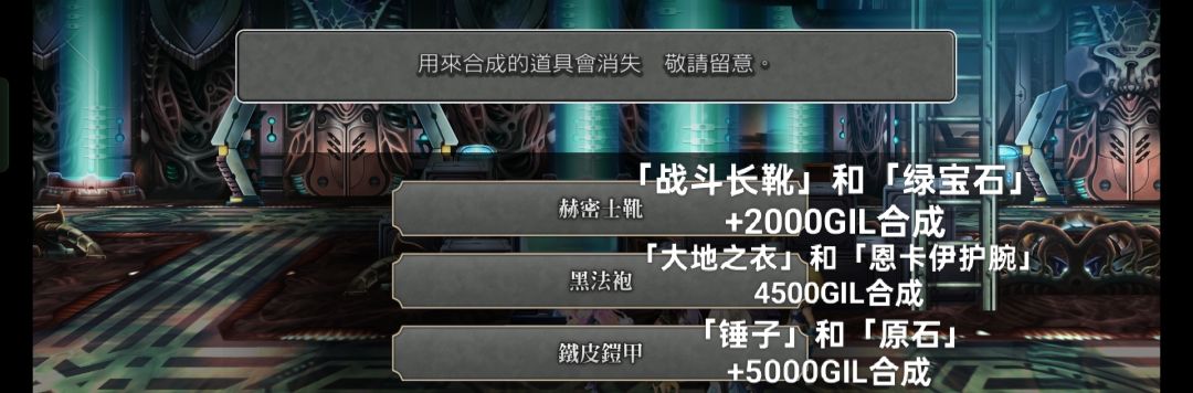 1)赫密士靴:战斗长靴(亚历山卓城镇商人购买)+绿宝石(依法树的 Fear小概率掉落)+2000GIL