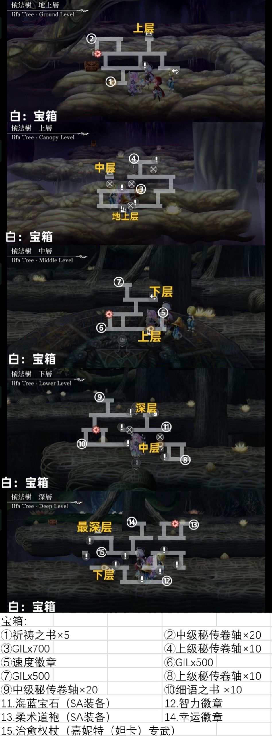 2)依法树 入口→地上层→上层→中层→下层→深层→小怪过度战x2→最深层Boss战 结束后比比 升五星→地上层 触发剧情→小怪过度战→触发一系列剧情→亚历山卓城 大厅→地下通道→第4话