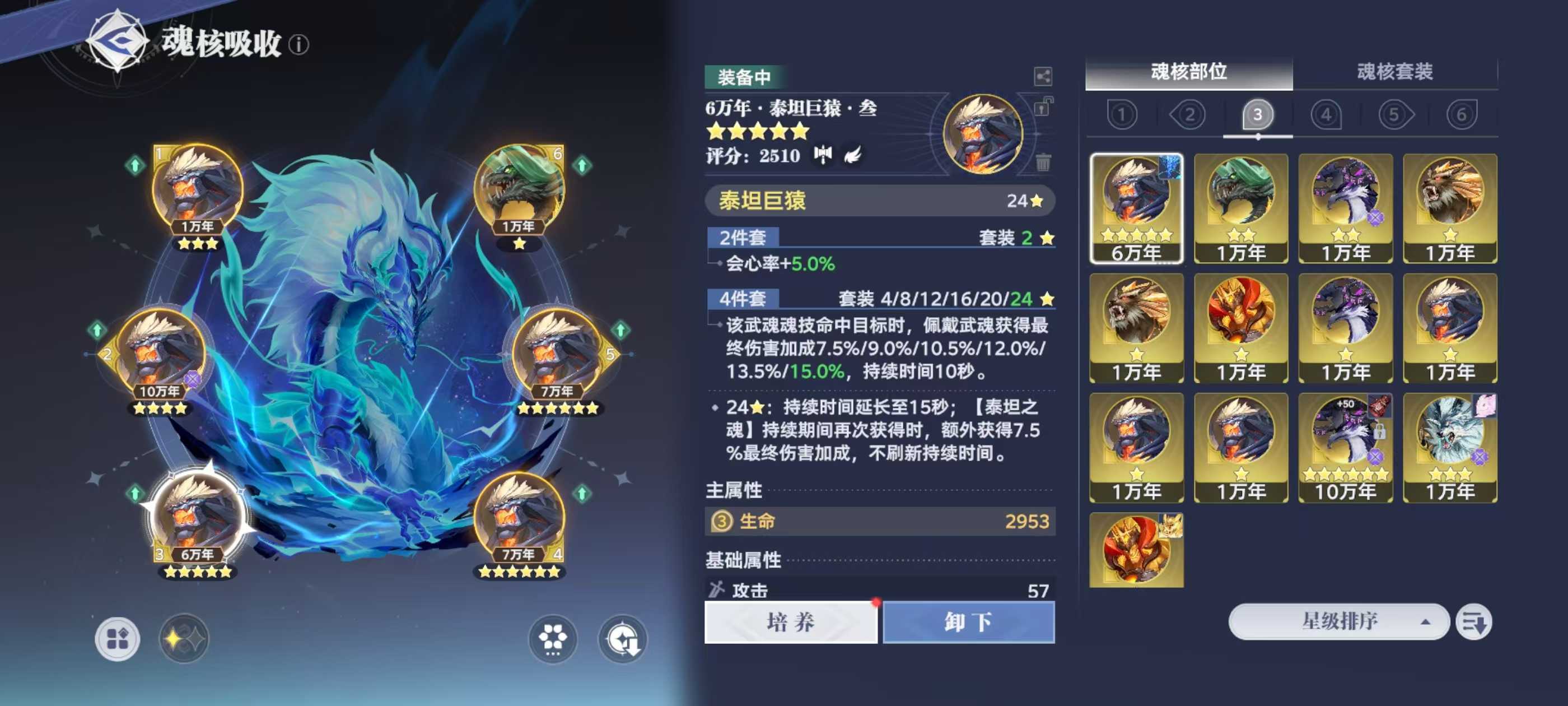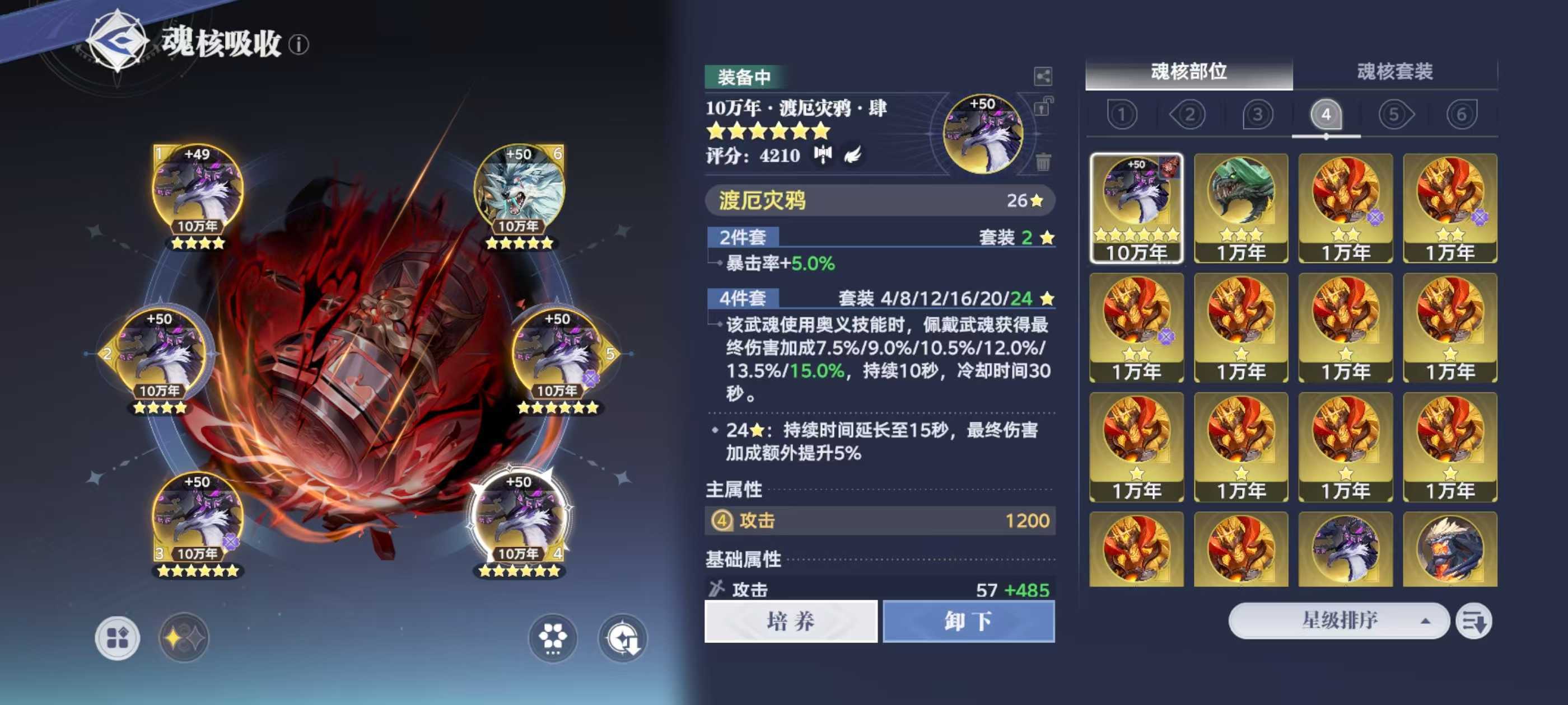优先凑够裸4星本体炸取6星魂核概率更高哦!这里我们优先吃另一个魂核狗粮,多留点想要升6星的魂核的本体。