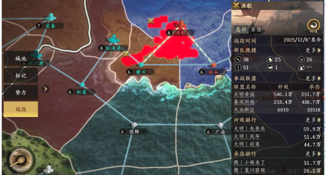 12月8日,北部战场,大明与秦风开始争夺渔歌,秦风的二盟天北新区,也投入主力加入战斗。但双方实力悬殊,最终大明以超两倍的歼敌数拿下渔歌。矛头直指松涛港。