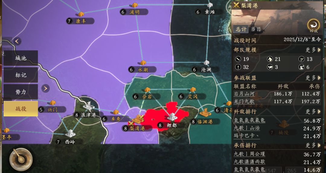 与此同时,南部战场日月山河与龙门九歌也陷入梨湾港的争夺战,双方势均力敌。最终日月山河以略微的优势拿下控制权,剑指鲤都。