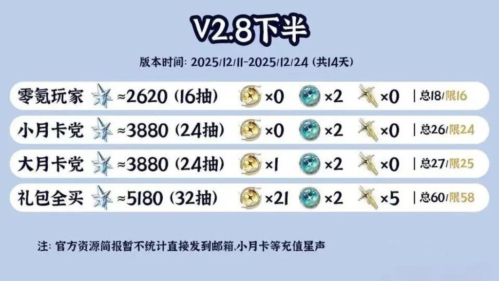 还有两天鸣潮2.8下半的纯复刻卡池就要开了,不少小伙伴都在等着这个池子,抽完之后就会衔接3.0版本。这次下半程的星声数量已经出来了,0氪玩家能拿2620星声,折算下来是16抽,小月卡和大小月卡玩家都是24抽。不过这次版本周期缩短到14天,能拿到这些星声其实挺合理的。