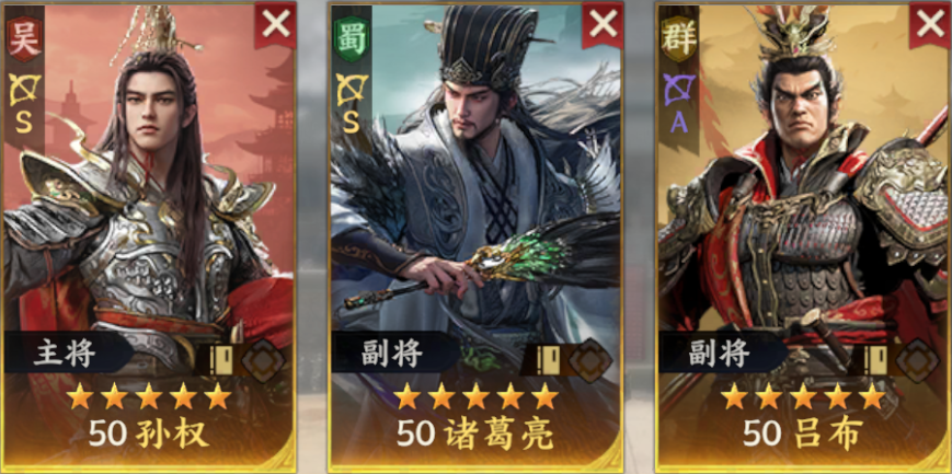 站在后面专挑残血打,触发溃败效果,实现快速战场收割。孙权主要负责加伤害和上易伤,诸葛亮补充单体伤害。如果想打更多群伤,可以把诸葛亮换成周瑜。