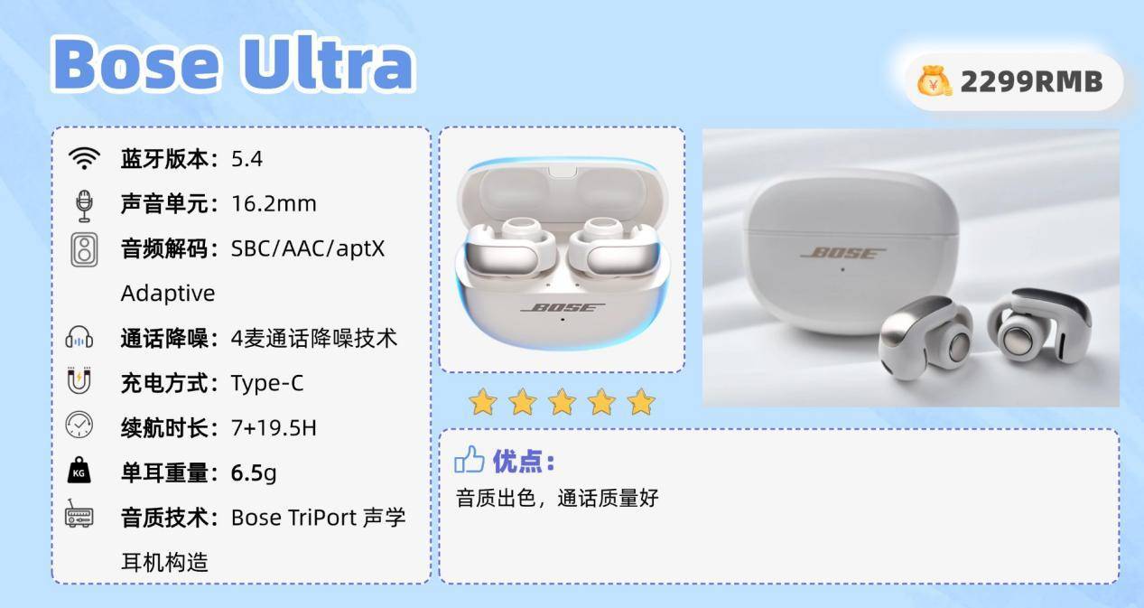 音质呈现上,Bose Ultra内置Open Audio技术,可有效抑制声音外泄;同时搭载Bose沉浸空间音频技术,提供动态头部追踪与静态固定声场两种模式,打造身临其境的沉浸式聆听体验。耳机支持aptX Adaptive编解码及Snapdragon Sound音频技术,配合蓝牙5.3多点连接功能,既能保障高质量无线音频传输,又能实现多设备间的顺畅切换,使用便捷性拉满。