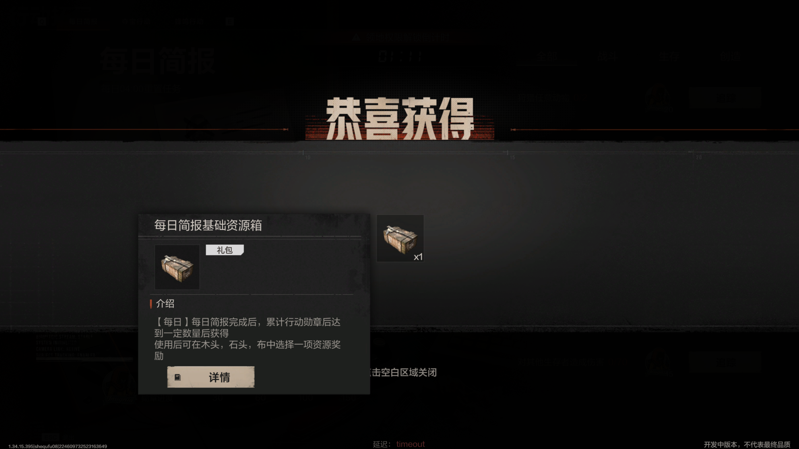 每日任务:每天达到一定活跃后可以在活动处领取基础物资箱,获得部分木材。