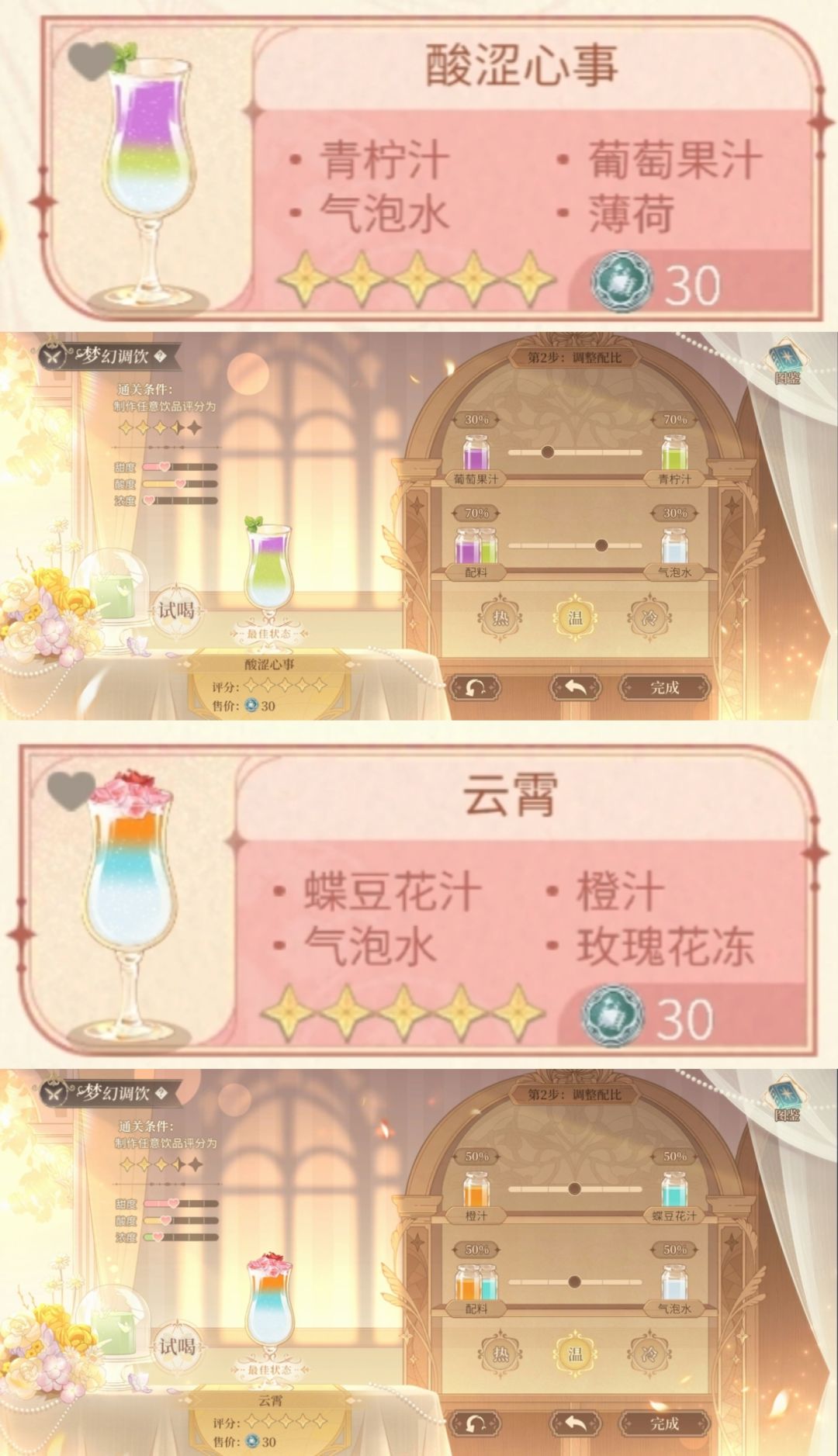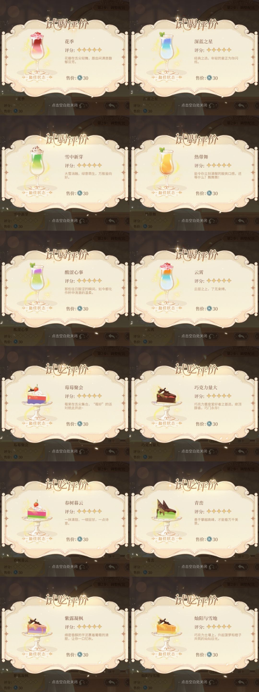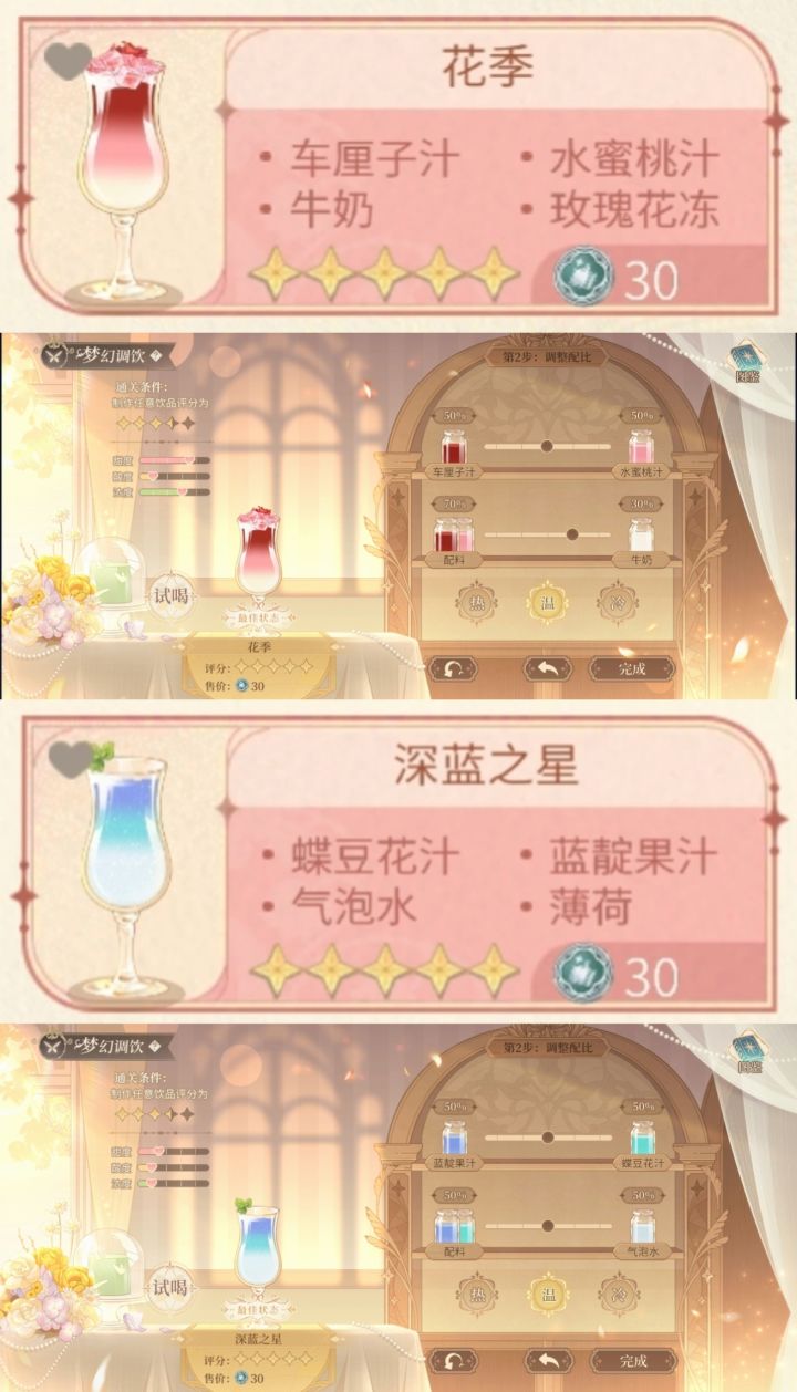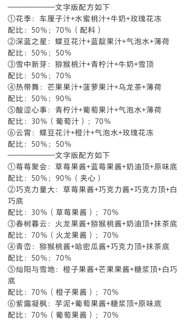 ③文字版配方总结见P2,相对饮料来说蛋糕步骤会多一些,需要速刷代币还是推荐做饮料哟(尤其推荐小路学长同款深蓝之星和云霄,只需选料不用调配比,省时又省力)