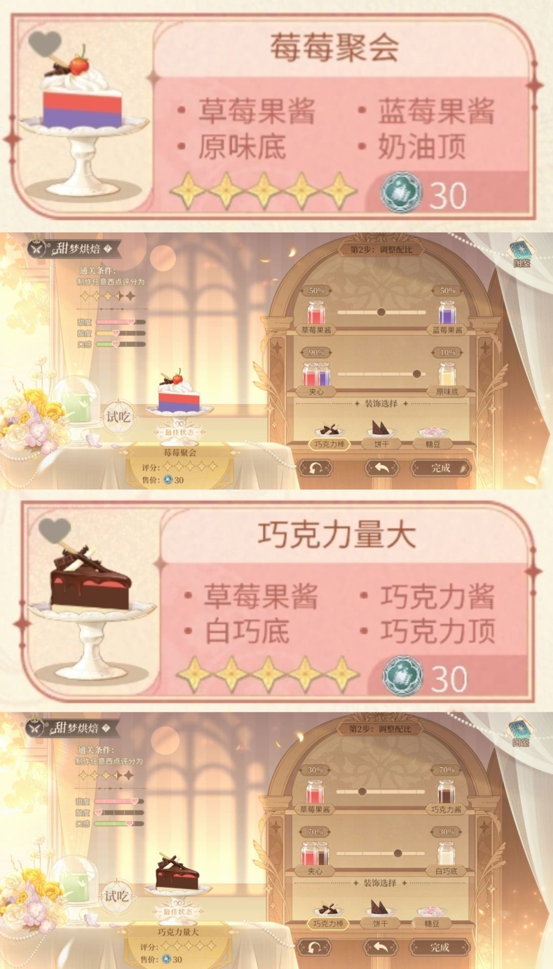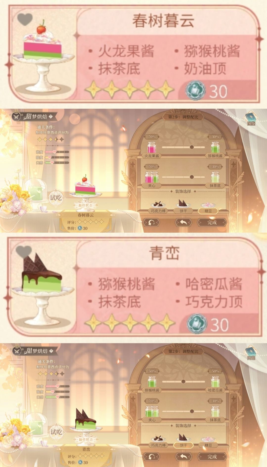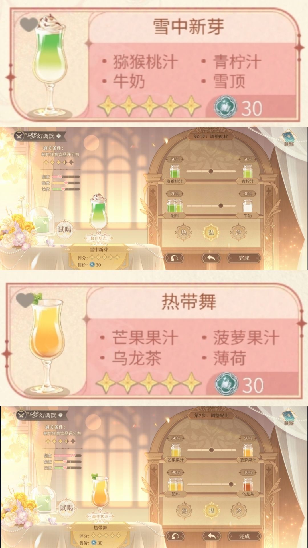 ③文字版配方总结见P2,相对饮料来说蛋糕步骤会多一些,需要速刷代币还是推荐做饮料哟(尤其推荐小路学长同款深蓝之星和云霄,只需选料不用调配比,省时又省力)