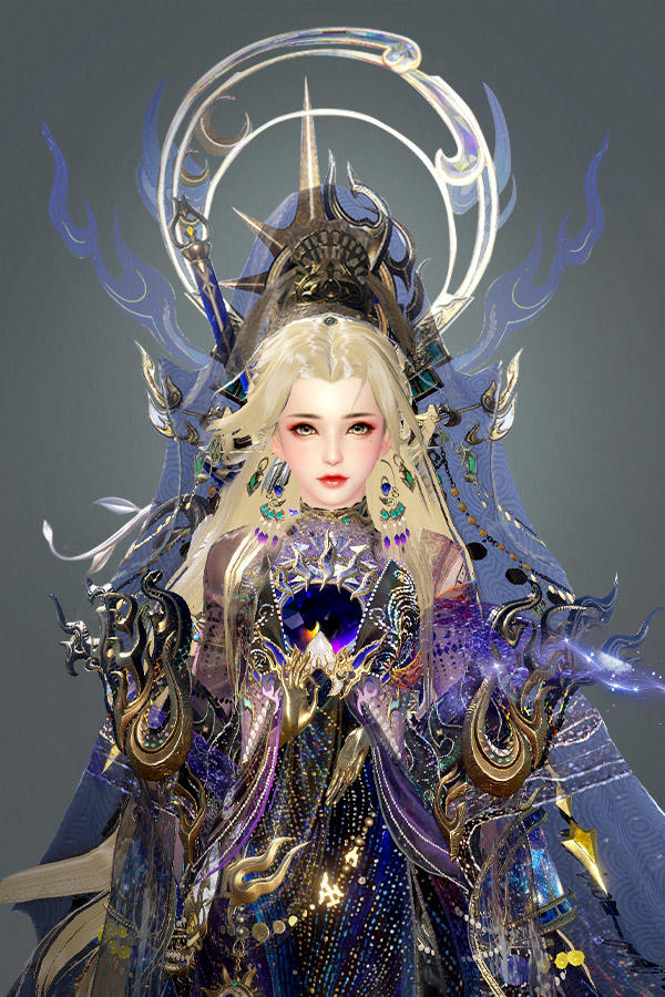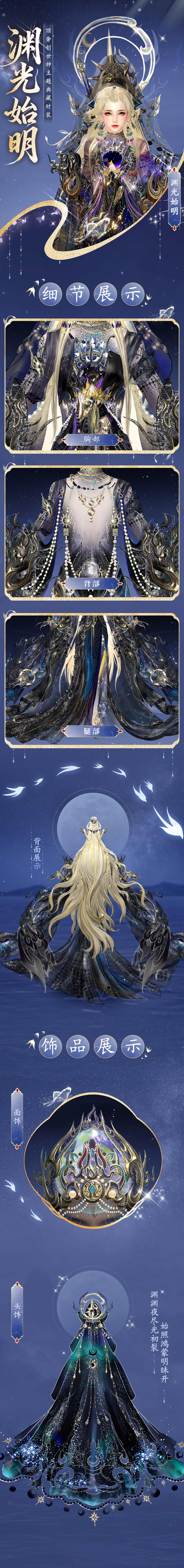女款时装以墨蓝渲染的鱼尾裙摆勾勒出风姿绰约的曲线,其上流转的银河与星辰纹样,皆由胸口处的“月之宝石”牵引而生,鸿蒙之主气质油然而生。腿部以永恒璀璨的钻石材质铸成。面庞半掩于珐琅宝石面饰之后,与身后巨大日轮头饰垂落的黑纱悄然融合,宛如执掌明暗的月之神祇。