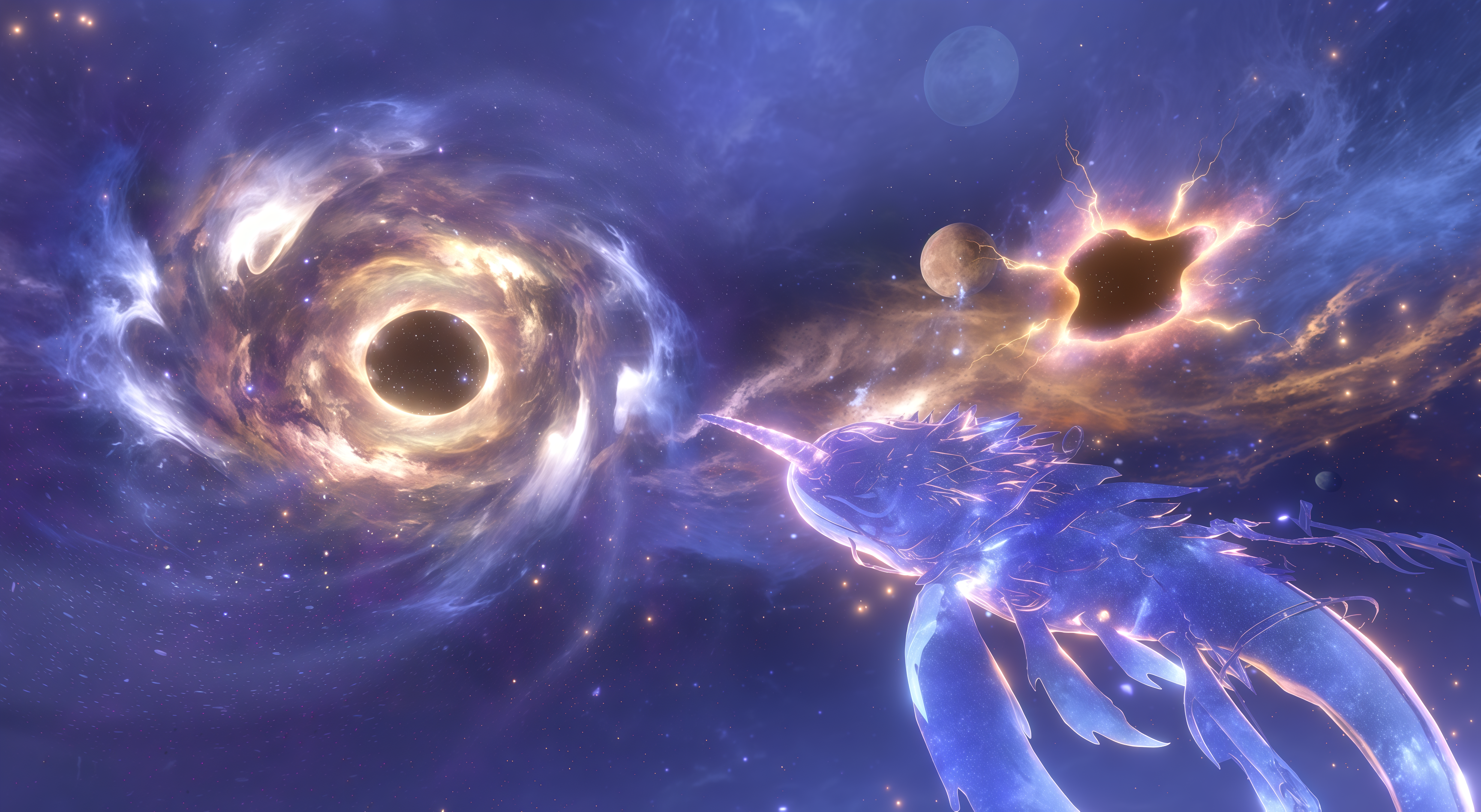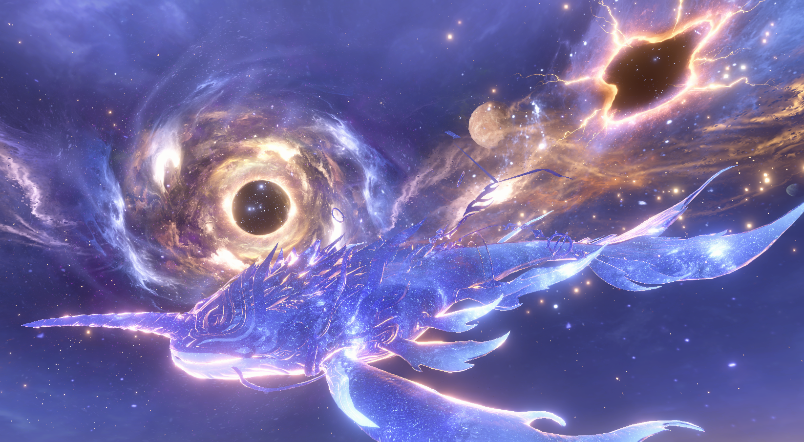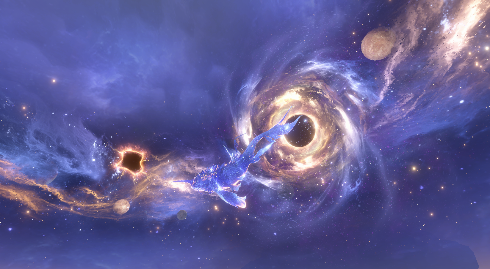 集齐「渊光始明」时装四件套获得的配套动作还能解锁全屏特效,无尽银河垂落,亿万星辰皆环绕此界徐徐运转。直至天外鲲鹏降临,游荡于此。
