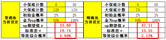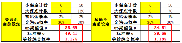 结论2:从数学期望的角度看,两个池子差异很小,精确池稍小。不过,精确池标准差确实优于普通池,极度欧非的情况在精确池会更少。两者分别等效于概率1.17%/1.18%的无保底池。