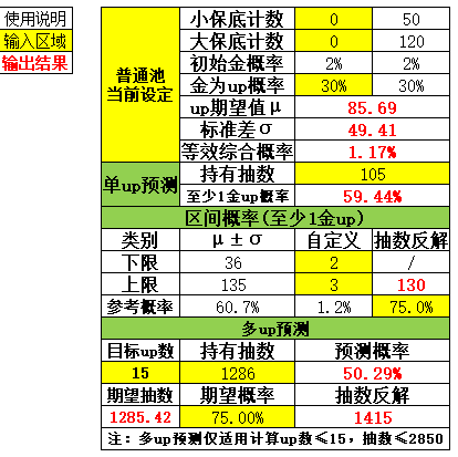 多up预测:根据大小保底,设定目标up数以及目标抽数,计算至少出指定up的概率。目前计算器仅按15up上限设计,不过六命15up,单100武器10up应该够用了。(单up无此部分和相关计算区域)比如上图,无大小保底计数情况下,105抽至少出1金up概率为59.44%,1286抽至少出15金up概率为50.29%
